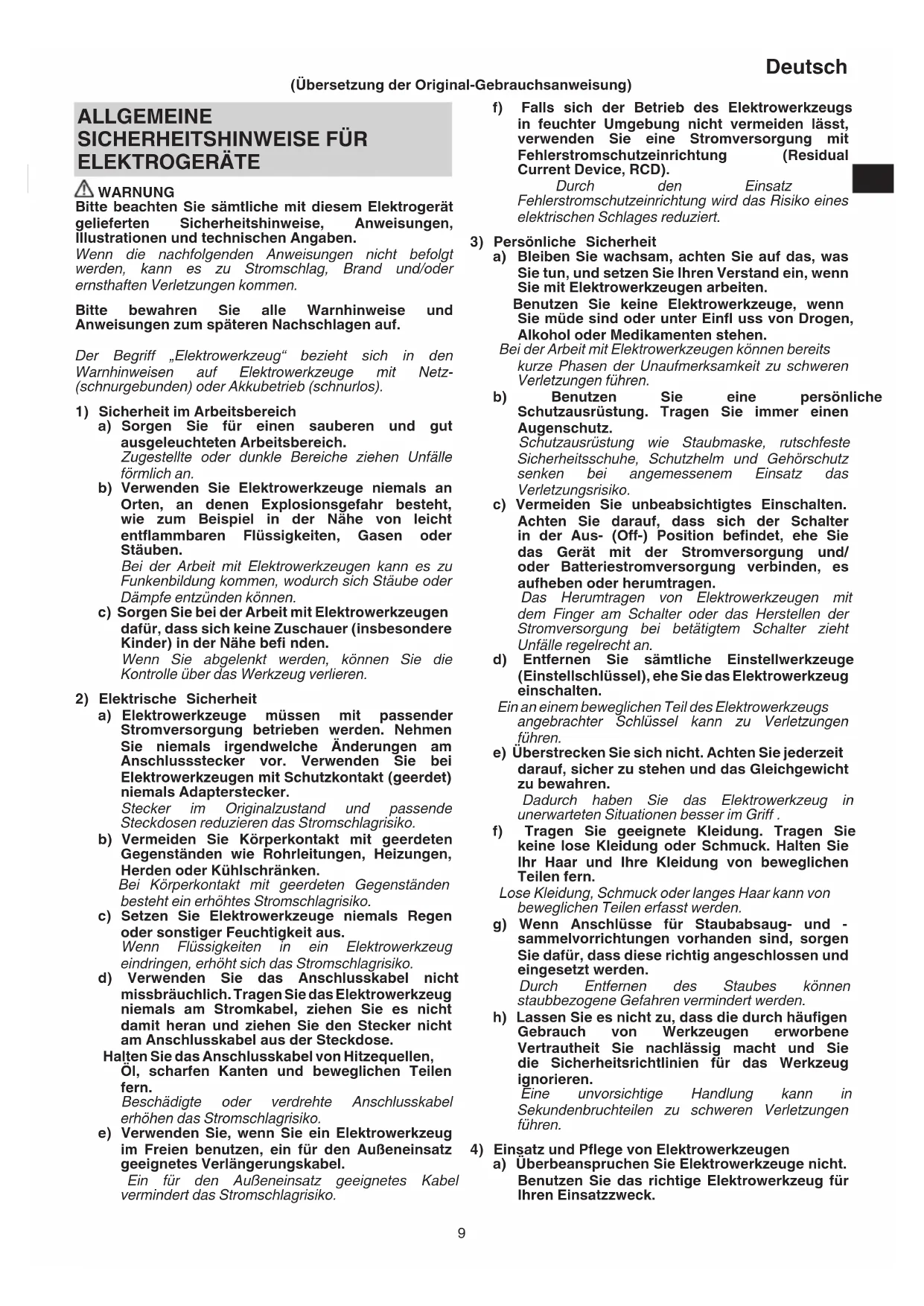 ELEKTROGERÄTE WARNUNG Bitte beachten Sie sämtliche mit diesem Elektrogerät gelieferten Sicherheitshinweise, Anweisungen, Illustrationen und technischen Angaben. Wenn die nachfolgenden Anweisungen nicht befolgt werden, kann es zu Stromschlag, Brand und/oder ernsthaften Verletzungen kommen. Bitte bewahren Sie alle Warnhinweise und Anweisungen zum späteren Nachschlagen auf. Der Begriff „Elektrowerkzeug“ bezieht sich in den Warnhinweisen auf Elektrowerkzeuge mit Netz- (schnurgebunden) oder Akkubetrieb (schnurlos).