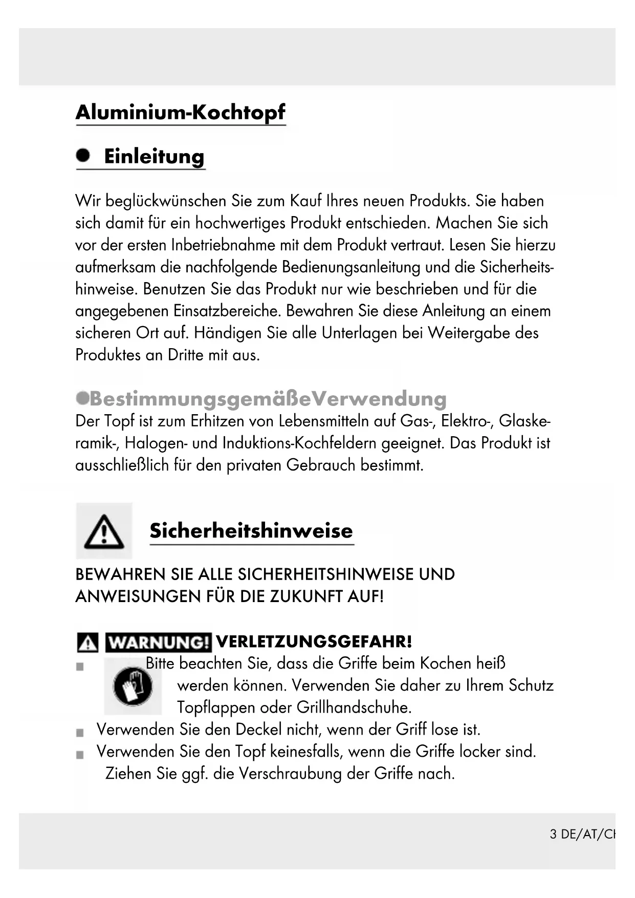 Indicazioni per l’uso e per la sicurezza IAN 293043DE / AT / CH Bedienungs- und Sicherheitshinweise Seite 3 FR / CH Instructions d‘utilisation et consignes de sécurité Page 7 IT / CH Indicazioni per l’uso e per la sicurezza Pagina 123 DE/AT/CH Aluminium-Kochtopf Einleitung Wir beglückwünschen Sie zum Kauf Ihres neuen Produkts. Sie haben sich damit für ein hochwertiges Produkt entschieden. Machen Sie sich vor der ersten Inbetriebnahme mit dem Produkt vertraut. Lesen Sie hierzu aufmerksam die nachfolgende Bedienungsanleitung und die Sicherheits- hinweise. Benutzen Sie das Produkt nur wie beschrieben und für die angegebenen Einsatzbereiche. Bewahren Sie diese Anleitung an einem sicheren Ort auf. Händigen Sie alle Unterlagen bei Weitergabe des Produktes an Dritte mit aus. Bestimmungsgemäße Verwendung Der Topf ist zum Erhitzen von Lebensmitteln auf Gas-, Elektro-, Glaske- ramik-, Halogen- und Induktions-Kochfeldern geeignet. Das Produkt ist ausschließlich für den privaten Gebrauch bestimmt. Sicherheitshinweise