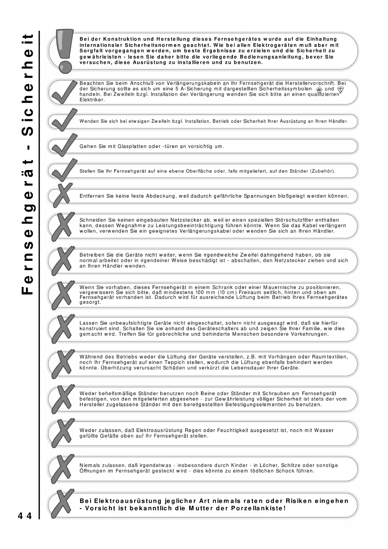 Bei der Konstruktion und Herstellung dieses Fernsehgerätes wurde auf die Einhaltung internationaler Sicherheitsnormen geachtet. Wie bei allen Elektrogeräten muß aber mit Sorgfalt vorgegangen werden, um beste Ergebnisse zu erzielen und die Sicherheit zu gewährleisten - lesen Sie daher bitte die vorliegende Bedienungsanleitung, bevor Sie versuchen, diese Ausrüstung zu installieren und zu benutzen. Schneiden Sie keinen eingebauten Netzstecker ab, weil er einen speziellen Störschutzfilter enthalten kann, dessen Wegnahme zu Leistungsbeeinträchtigung führen könnte. Wenn Sie das Kabel verlängern wollen, verwenden Sie ein geeignetes Verlängerungskabel oder wenden Sie sich an Ihren Händler. Betreiben Sie die Geräte nicht weiter, wenn Sie irgendwelche Zweifel dahingehend haben, ob sie normal arbeitet oder in irgendeiner Weise beschädigt ist - abschalten, den Netzstecker ziehen und sich an Ihren Händler wenden. Wenn Sie vorhaben, dieses Fernsehgerät in einem Schrank oder einer Mauernische zu positionieren, vergewissern Sie sich bitte, daß mindestens 100 mm (10 cm) Freiraum seitlich, hinten und oben am Fernsehgerät vorhanden ist. Dadurch wird für ausreichende Lüftung beim Betrieb Ihres Fernsehgerätes gesorgt. Lassen Sie unbeaufsichtigte Geräte nicht eingeschaltet, sofern nicht ausgesagt wird, daß sie hierfür konstruiert sind. Schalten Sie sie anhand des Geräteschalters ab und zeigen Sie Ihrer Familie, wie dies gemacht wird. Treffen Sie für gebrechliche und behinderte Menschen besondere Vorkehrungen. Während des Betriebs weder die Lüftung der Geräte verstellen, z.B. mit Vorhängen oder Raumtextilien, noch Ihr Fernsehgerät auf einen Teppich stellen, wodurch die Lüftung ebenfalls behindert werden könnte. Überhitzung verursacht Schäden und verkürzt die Lebensdauer Ihrer Geräte. Weder behelfsmäßige Ständer benutzen noch Beine oder Ständer mit Schrauben am Fernsehgerät befestigen, von den mitgelieferten abgesehen - zur Gewährleistung völliger Sicherheit ist stets der vom Hersteller zugelassene Ständer mit den bereitgestellten Befestigungselementen zu benutzen. Weder zulassen, daß Elektroausrüstung Regen oder Feuchtigkeit ausgesetzt ist, noch mit Wasser gefüllte Gefäße oben auf Ihr Fernsehgerät stellen. Niemals zulassen, daß irgendetwas - insbesondere durch Kinder - in Löcher, Schlitze oder sonstige Öffnungen im Fernsehgerät gesteckt wird - dies könnte zu einem tödlichen Schock führen. Bei Elektroausrüstung jeglicher Art niemals raten oder Risiken eingehen - Vorsicht ist bekanntlich die Mutter der Porzellankiste! Gehen Sie mit Glasplatten oder -türen an vorsichtig um. Wenden Sie sich bei etwaigen Zweifeln bzgl. Installation, Betrieb oder Sicherheit Ihrer Ausrüstung an Ihren Händler. Stellen Sie Ihr Fernsehgerät auf eine ebene Oberfläche oder, falls mitgeliefert, auf den Ständer (Zubehör). Entfernen Sie keine feste Abdeckung, weil dadurch gefährliche Spannungen bloßgelegt werden können. Beachten Sie beim Anschluß von Verlängerungskabeln an Ihr Fernsehgerät die Herstellervorschrift. Bei der Sicherung sollte es sich um eine 5 A-Sicherung mit dargestellten Sicherheitssymbolen und handeln. Bei Zweifeln bzgl. Installation der Verlängerung wenden Sie sich bitte an einen qualifizierten Elektriker.stets Batterien - Sicherheit und Installation