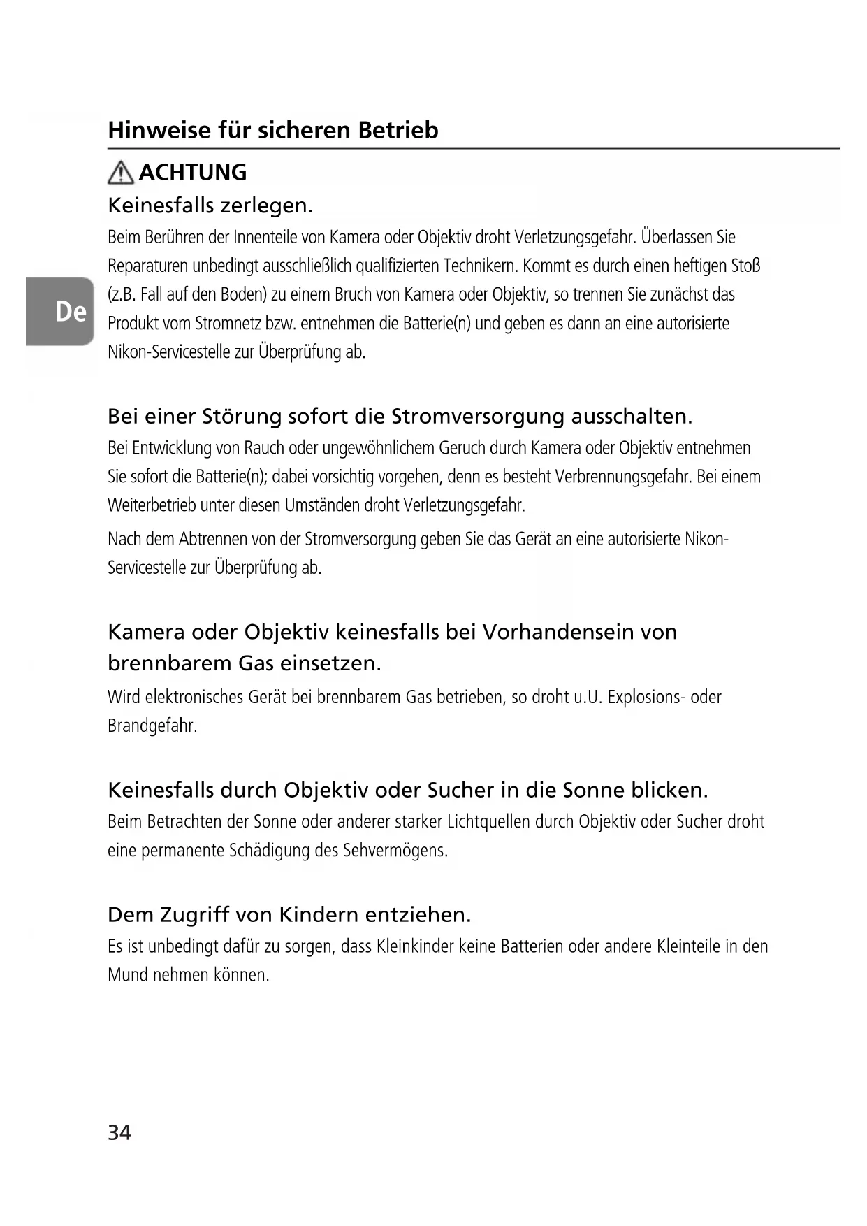 Keinesfalls zerlegen. Beim Berühren der Innenteile von Kamera oder Objektiv droht Verletzungsgefahr. Überlassen Sie Reparaturen unbedingt ausschließlich qualifizierten Technikern. Kommt es durch einen heftigen Stoß (z.B. Fall auf den Boden) zu einem Bruch von Kamera oder Objektiv, so trennen Sie zunächst das Produkt vom Stromnetz bzw. entnehmen die Batterie(n) und geben es dann an eine autorisierte Nikon-Servicestelle zur Überprüfung ab. Bei einer Störung sofort die Stromversorgung ausschalten. Bei Entwicklung von Rauch oder ungewöhnlichem Geruch durch Kamera oder Objektiv entnehmen Sie sofort die Batterie(n); dabei vorsichtig vorgehen, denn es besteht Verbrennungsgefahr. Bei einem Weiterbetrieb unter diesen Umständen droht Verletzungsgefahr. Nach dem Abtrennen von der Stromversorgung geben Sie das Gerät an eine autorisierte Nikon- Servicestelle zur Überprüfung ab. Kamera oder Objektiv keinesfalls bei Vorhandensein von brennbarem Gas einsetzen. Wird elektronisches Gerät bei brennbarem Gas betrieben, so droht u.U. Explosions- oder Brandgefahr. Keinesfalls durch Objektiv oder Sucher in die Sonne blicken. Beim Betrachten der Sonne oder anderer starker Lichtquellen durch Objektiv oder Sucher droht eine permanente Schädigung des Sehvermögens. Dem Zugriff von Kindern entziehen. Es ist unbedingt dafür zu sorgen, dass Kleinkinder keine Batterien oder andere Kleinteile in den Mund nehmen können. Hinweise für sicheren Betrieb ACHTUNG35