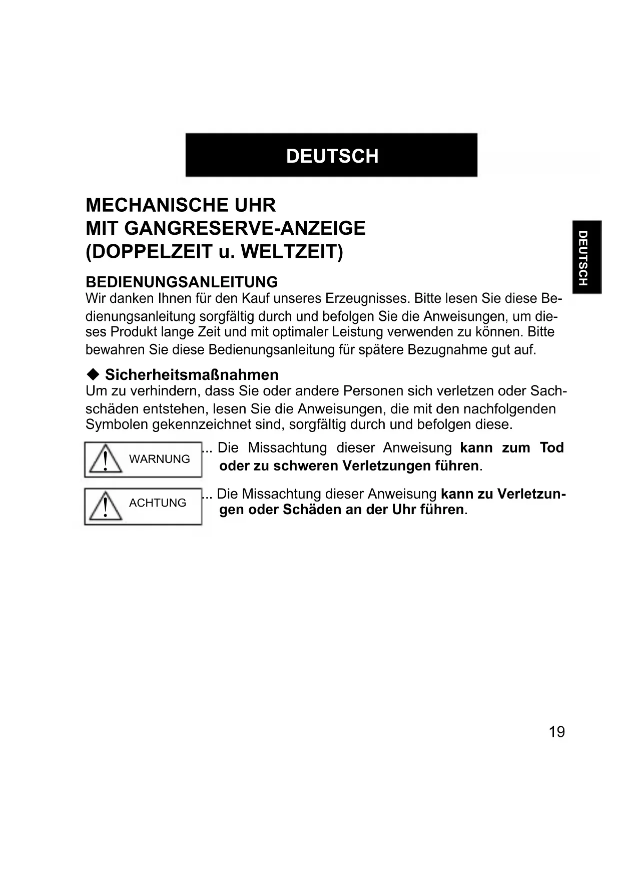 The above shows that 20 minutes have elapsed from 10:10.19 DEUTSCH DEUTSCH MECHANISCHE UHR MIT GANGRESERVE-ANZEIGE (DOPPELZEIT u. WELTZEIT) BEDIENUNGSANLEITUNG Wir danken Ihnen für den Kauf unseres Erzeugnisses. Bitte lesen Sie diese Be- dienungsanleitung sorgfältig durch und befolgen Sie die Anweisungen, um die- ses Produkt lange Zeit und mit optimaler Leistung verwenden zu können. Bitte bewahren Sie diese Bedienungsanleitung für spätere Bezugnahme gut auf. Sicherheitsmaßnahmen Um zu verhindern, dass Sie oder andere Personen sich verletzen oder Sach- schäden entstehen, lesen Sie die Anweisungen, die mit den nachfolgenden Symbolen gekennzeichnet sind, sorgfältig durch und befolgen diese.
