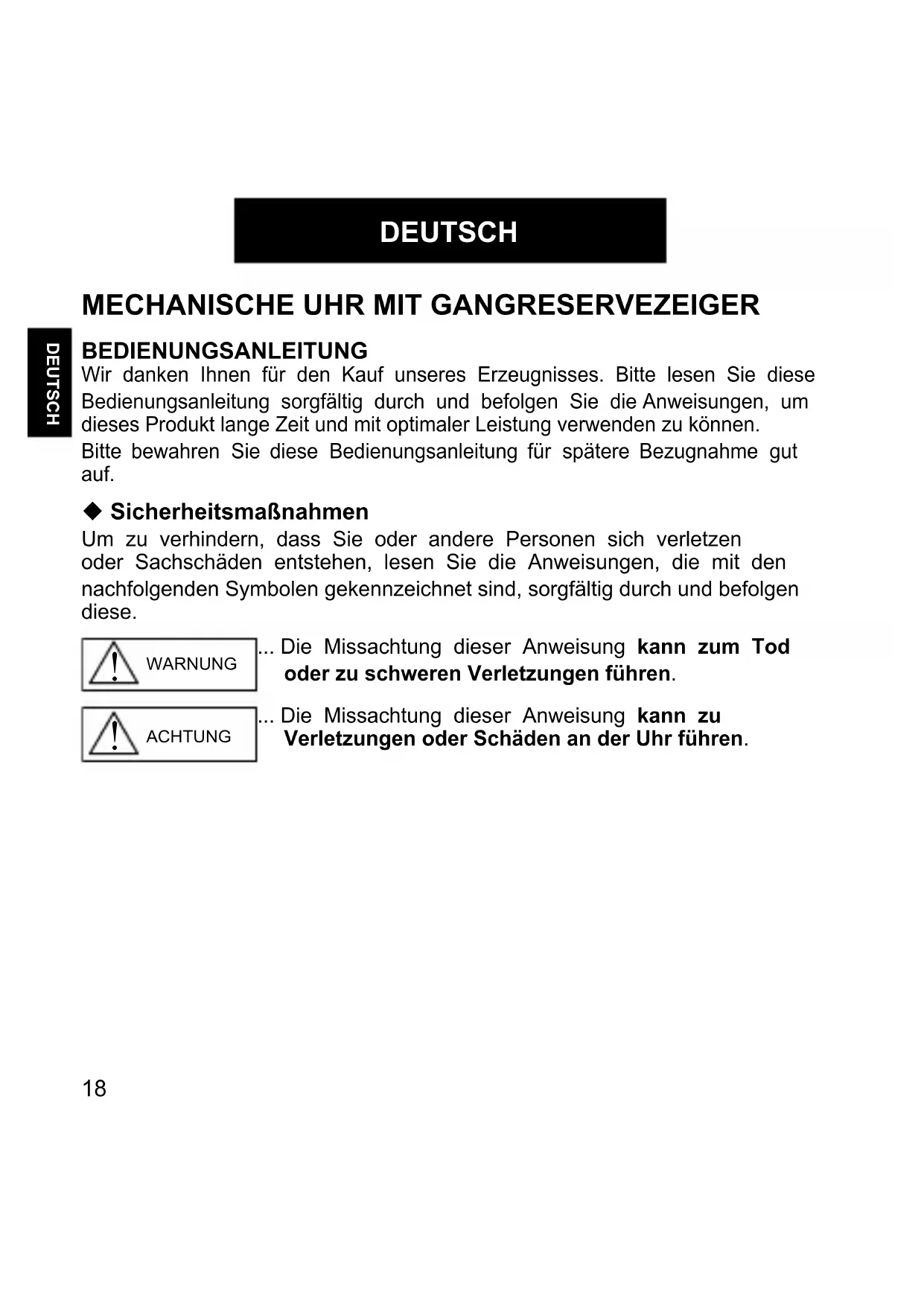 ACHTUNG ... Die Missachtung dieser Anweisung kann zu Verletzungen oder Schäden an der Uhr führen.19 DEUTSCH