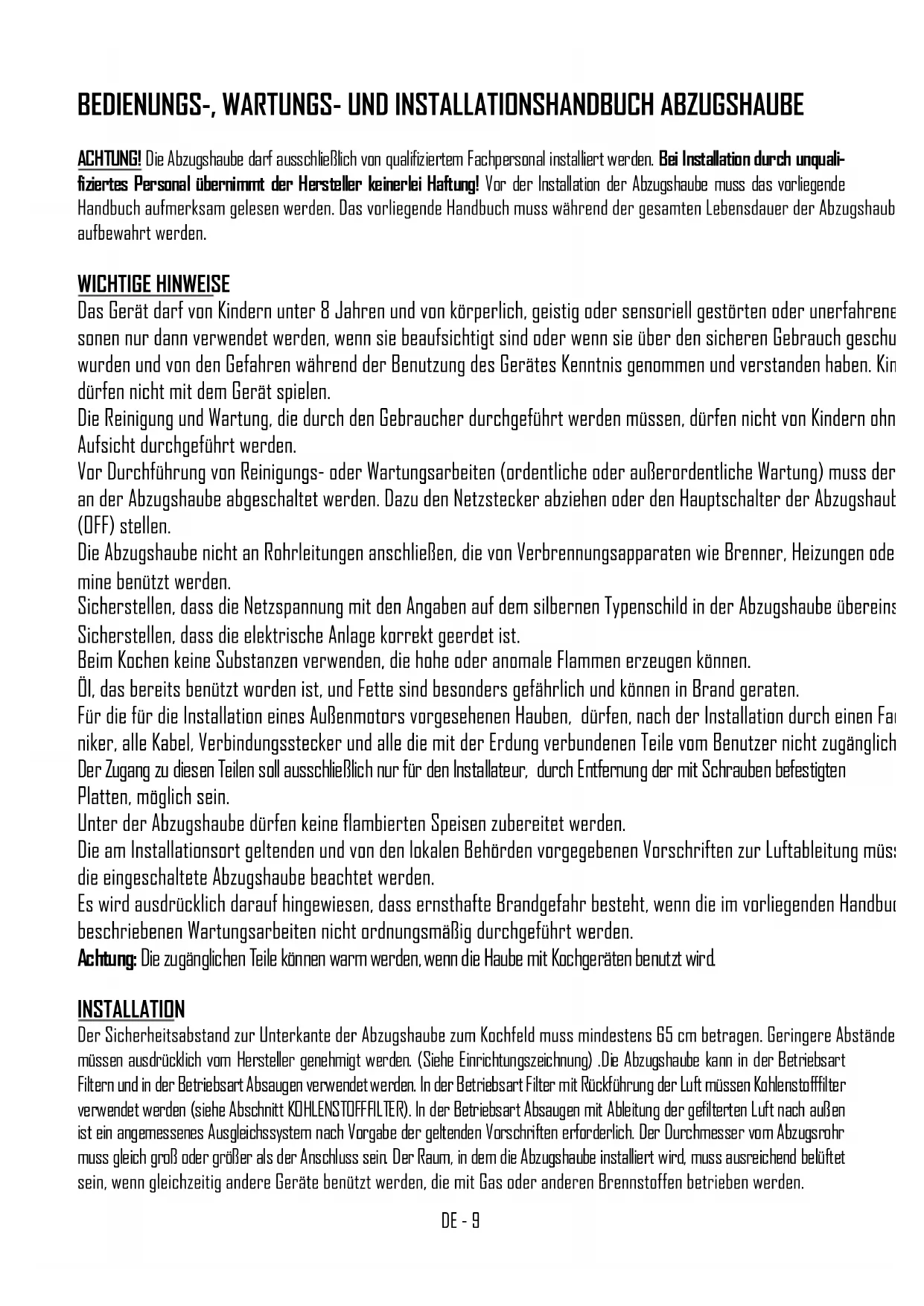ACHTUNG! Die Abzugshaube darf ausschließlich von qualifiziertem Fachpersonal installiert werden. Bei Installation durch unquali- fiziertes Personal übernimmt der Hersteller keinerlei Haftung! Vor der Installation der Abzugshaube muss das vorliegende Handbuch aufmerksam gelesen werden. Das vorliegende Handbuch muss während der gesamten Lebensdauer der Abzugshaube aufbewahrt werden. WICHTIGE HINWEISE Das Gerät darf von Kindern unter 8 Jahren und von körperlich, geistig oder sensoriell gestörten oder unerfahrenen Per- sonen nur dann verwendet werden, wenn sie beaufsichtigt sind oder wenn sie über den sicheren Gebrauch geschult wurden und von den Gefahren während der Benutzung des Gerätes Kenntnis genommen und verstanden haben. Kinder dürfen nicht mit dem Gerät spielen. Die Reinigung und Wartung, die durch den Gebraucher durchgeführt werden müssen, dürfen nicht von Kindern ohne Aufsicht durchgeführt werden. Vor Durchführung von Reinigungs- oder Wartungsarbeiten (ordentliche oder außerordentliche Wartung) muss der Strom an der Abzugshaube abgeschaltet werden. Dazu den Netzstecker abziehen oder den Hauptschalter der Abzugshaube auf 0 (OFF) stellen. Die Abzugshaube nicht an Rohrleitungen anschließen, die von Verbrennungsapparaten wie Brenner, Heizungen oder Ka- mine benützt werden. Sicherstellen, dass die Netzspannung mit den Angaben auf dem silbernen Typenschild in der Abzugshaube übereinstimmt. Sicherstellen, dass die elektrische Anlage korrekt geerdet ist. Beim Kochen keine Substanzen verwenden, die hohe oder anomale Flammen erzeugen können. Öl, das bereits benützt worden ist, und Fette sind besonders gefährlich und können in Brand geraten. Für die für die Installation eines Außenmotors vorgesehenen Hauben, dürfen, nach der Installation durch einen Fachtech- niker, alle Kabel, Verbindungsstecker und alle die mit der Erdung verbundenen Teile vom Benutzer nicht zugänglich sein. Der Zugang zu diesen Teilen soll ausschließlich nur für den Installateur, durch Entfernung der mit Schrauben befestigten Platten, möglich sein. Unter der Abzugshaube dürfen keine flambierten Speisen zubereitet werden. Die am Installationsort geltenden und von den lokalen Behörden vorgegebenen Vorschriften zur Luftableitung müssen für die eingeschaltete Abzugshaube beachtet werden. Es wird ausdrücklich darauf hingewiesen, dass ernsthafte Brandgefahr besteht, wenn die im vorliegenden Handbuch beschriebenen Wartungsarbeiten nicht ordnungsmäßig durchgeführt werden. Achtung: Die zugänglichen Teile können warm werden, wenn die Haube mit Kochgeräten benutzt wird. INSTALLATION Der Sicherheitsabstand zur Unterkante der Abzugshaube zum Kochfeld muss mindestens 65 cm betragen. Geringere Abstände müssen ausdrücklich vom Hersteller genehmigt werden. (Siehe Einrichtungszeichnung) .Die Abzugshaube kann in der Betriebsart Filtern und in der Betriebsart Absaugen verwendet werden. In der Betriebsart Filter mit Rückführung der Luft müssen Kohlenstofffilter verwendet werden (siehe Abschnitt KOHLENSTOFFFILTER). In der Betriebsart Absaugen mit Ableitung der gefilterten Luft nach außen ist ein angemessenes Ausgleichssystem nach Vorgabe der geltenden Vorschriften erforderlich. Der Durchmesser vom Abzugsrohr muss gleich groß oder größer als der Anschluss sein. Der Raum, in dem die Abzugshaube installiert wird, muss ausreichend belüftet sein, wenn gleichzeitig andere Geräte benützt werden, die mit Gas oder anderen Brennstoffen betrieben werden.DE - 10 Hauben für Außenmotore. Die für Außenmotore vorbereiteten Hauben sind mit einem Verbindungsstecker für den Kabelanschluss am Außenmotor ausgestattet. Dieser Verbindungsstecker befindet sich innerhalb der Haube. Das Kabel für den Außenmotor durch die dafür bestimmte Öffnung an der Haube (üblicherweise in der Nähe der Rauchablassöffnung) ziehen und die beiden Stecker miteinander verbinden. Für diesen Vorgang verweisen wir auf die entsprechende Zeichnung in der Gebrauchsanweisung der Außenmotore. Die Hauben ohne Motor (Art.*0***) müssen ausschließlich mit der vom Hersteller gelieferten und angegebenen Ansaugeinheit mit einer maximalen Leistung von 640 W installiert und angeschlossen werden. Für die für die Installation eines Außenmotors vorgesehenen Hauben, dürfen, nach der Installation durch einen Fachtechniker, alle Kabel, Verbindungsstecker und alle die mit der Erdung verbundenen Teile vom Benutzer nicht zugänglich sein. Der Zugang zu diesen Teilen soll ausschließlich nur für den Installateur, durch Entfernung der mit Schrauben befestigten Platten, möglich sein. MONTAGEANLEITUNG Achtung! Falls die Schrauben und Dϋbel mit dem rodukt mitgeliefert curde, sich vergewissern, daβ sie fϋr die Art der Wand, an der die Abzugshaube befestigt werden soll, geeignet sind. Für die Montage der Abzugshaube das mitgelieferte Zubehör verwenden und wie auf dem beiliegenden Informationsblatt dargestellt vorgehen. STROMANSCHLUSS Der Stromanschluss darf ausschließlich von einem qualifizierten Elektriker durchgeführt werden und muss unter Beachtung der am Installationsort geltenden Vorschriften erfolgen. Sicherstellen, dass die Netzspannung mit den Angaben auf dem silbernen Typenschild in der Abzugshaube übereinstimmt. Sicherstellen, dass die elektrische Anlage unter Beachtung der geltenden Gesetzgebung und mit einer ordnungsmäßigen Erdung ausgeführt worden ist. Das Stromkabel der Abzugshaube muss besonders sorgfältig verlegt werden und darf auf keinen Fall durch Löcher geführt werden, die keine Kabelführung haben. Wird das Gerät direkt an das Stromnetz angeschlossen, muss eine Vorrichtung vorgesehen werden, die eine Trennung vom Strom- netz, mit einem Öffnungsabstand der Kontakte, die eine komplette Abtrennung in den Zuständen der Überspannungskategorie III, entsprechend der Installationsvorschriften, ermöglicht, gewährleistet. Der Stecker bzw. der allpolige Schalter muss bei installiertem Gerät zugänglich sein. Ist 