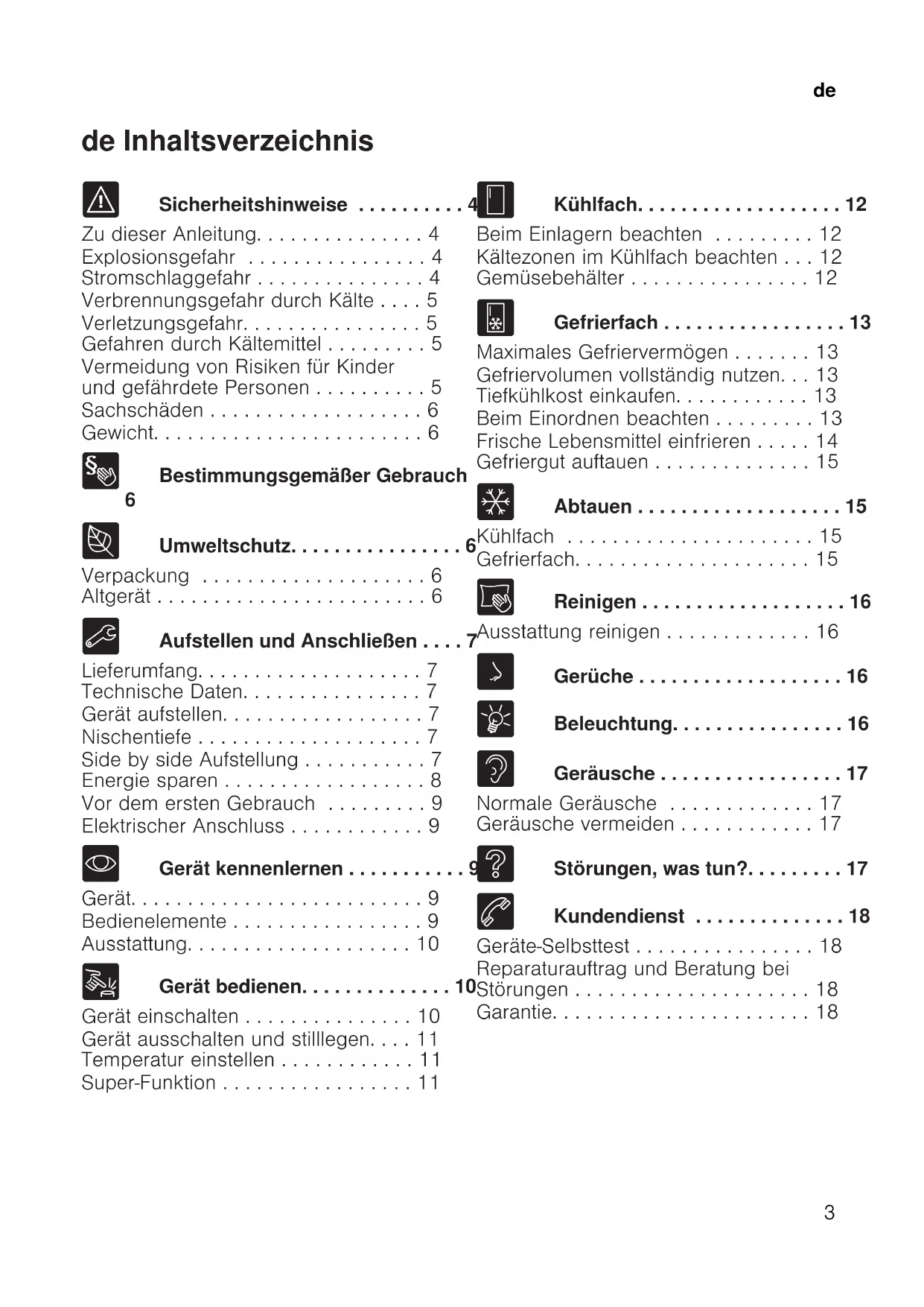 - Gerät kennenlernen . . . . . . . . . . . 9 Gerät. . . . . . . . . . . . . . . . . . . . . . . . . . 9 Bedienelemente . . . . . . . . . . . . . . . . . 9 Ausstattung. . . . . . . . . . . . . . . . . . . . 10 1 Gerät bedienen. . . . . . . . . . . . . . 10 Gerät einschalten . . . . . . . . . . . . . . . 10 Gerät ausschalten und stilllegen. . . . 11 Temperatur einstellen . . . . . . . . . . . . 11 Super-Funktion . . . . . . . . . . . . . . . . . 11 U Kühlfach. . . . . . . . . . . . . . . . . . . 12 Beim Einlagern beachten . . . . . . . . . 12 Kältezonen im Kühlfach beachten . . . 12 Gemüsebehälter . . . . . . . . . . . . . . . . 12 W Gefrierfach . . . . . . . . . . . . . . . . . 13 Maximales Gefriervermögen . . . . . . . 13 Gefriervolumen vollständig nutzen. . . 13 Tiefkühlkost einkaufen. . . . . . . . . . . . 13 Beim Einordnen beachten . . . . . . . . . 13 Frische Lebensmittel einfrieren . . . . . 14 Gefriergut auftauen . . . . . . . . . . . . . . 15 = Abtauen . . . . . . . . . . . . . . . . . . . 15 Kühlfach . . . . . . . . . . . . . . . . . . . . . . 15 Gefrierfach. . . . . . . . . . . . . . . . . . . . . 15 D Reinigen . . . . . . . . . . . . . . . . . . . 16 Ausstattung reinigen . . . . . . . . . . . . . 16 l Gerüche . . . . . . . . . . . . . . . . . . . 16 9 Beleuchtung. . . . . . . . . . . . . . . . 16 > Geräusche . . . . . . . . . . . . . . . . . 17 Normale Geräusche . . . . . . . . . . . . . 17 Geräusche vermeiden . . . . . . . . . . . . 17 3 Störungen, was tun?. . . . . . . . . 17 4 Kundendienst . . . . . . . . . . . . . . 18 Geräte-Selbsttest . . . . . . . . . . . . . . . . 18 Reparaturauftrag und Beratung bei Störungen . . . . . . . . . . . . . . . . . . . . . 18 Garantie. . . . . . . . . . . . . . . . . . . . . . . 18de Sicherheitshinweise