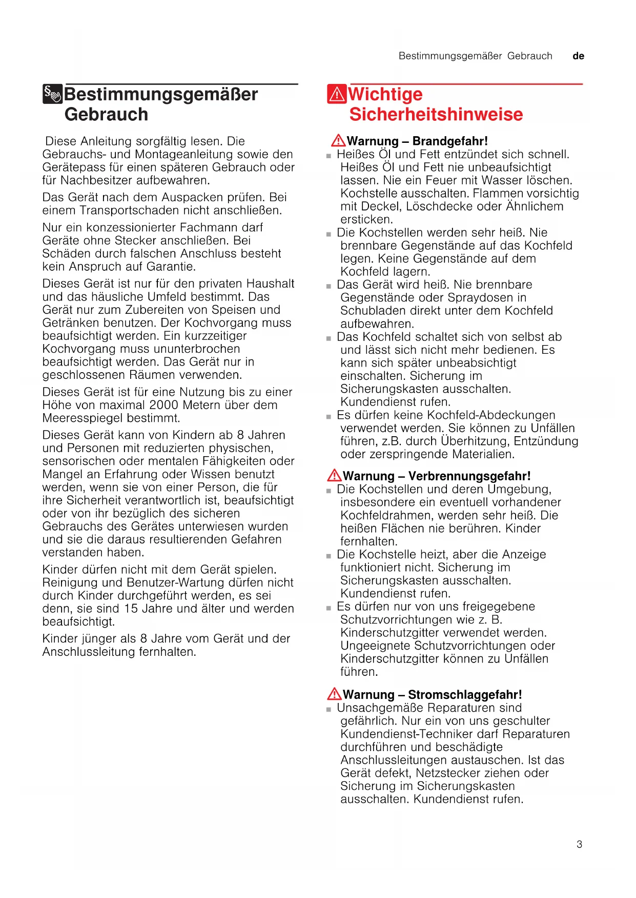 8Bestimmungsgemäßer Gebrauch Be s t i mmungsgemäßer Gebr auch Diese Anleitung sorgfältig lesen. Die Gebrauchs- und Montageanleitung sowie den Gerätepass für einen späteren Gebrauch oder für Nachbesitzer aufbewahren. Das Gerät nach dem Auspacken prüfen. Bei einem Transportschaden nicht anschließen. Nur ein konzessionierter Fachmann darf Geräte ohne Stecker anschließen. Bei Schäden durch falschen Anschluss besteht kein Anspruch auf Garantie. Dieses Gerät ist nur für den privaten Haushalt und das häusliche Umfeld bestimmt. Das Gerät nur zum Zubereiten von Speisen und Getränken benutzen. Der Kochvorgang muss beaufsichtigt werden. Ein kurzzeitiger Kochvorgang muss ununterbrochen beaufsichtigt werden. Das Gerät nur in geschlossenen Räumen verwenden. Dieses Gerät ist für eine Nutzung bis zu einer Höhe von maximal 2000 Metern über dem Meeresspiegel bestimmt. Dieses Gerät kann von Kindern ab 8 Jahren und Personen mit reduzierten physischen, sensorischen oder mentalen Fähigkeiten oder Mangel an Erfahrung oder Wissen benutzt werden, wenn sie von einer Person, die für ihre Sicherheit verantwortlich ist, beaufsichtigt oder von ihr bezüglich des sicheren Gebrauchs des Gerätes unterwiesen wurden und sie die daraus resultierenden Gefahren verstanden haben. Kinder dürfen nicht mit dem Gerät spielen. Reinigung und Benutzer-Wartung dürfen nicht durch Kinder durchgeführt werden, es sei denn, sie sind 15 Jahre und älter und werden beaufsichtigt. Kinder jünger als 8 Jahre vom Gerät und der Anschlussleitung fernhalten. (Wichtige Sicherheitshinweise Wichtige Sicherheitshinweise :Warnung – Brandgefahr! ■ Heißes Öl und Fett entzündet sich schnell. Heißes Öl und Fett nie unbeaufsichtigt lassen. Nie ein Feuer mit Wasser löschen. Kochstelle ausschalten. Flammen vorsichtig mit Deckel, Löschdecke oder Ähnlichem ersticken. Brandgefahr! ■ Die Kochstellen werden sehr heiß. Nie brennbare Gegenstände auf das Kochfeld legen. Keine Gegenstände auf dem Kochfeld lagern. Brandgefahr! ■ Das Gerät wird heiß. Nie brennbare Gegenstände oder Spraydosen in Schubladen direkt unter dem Kochfeld aufbewahren. Brandgefahr! ■ Das Kochfeld schaltet sich von selbst ab und lässt sich nicht mehr bedienen. Es kann sich später unbeabsichtigt einschalten. Sicherung im Sicherungskasten ausschalten. Kundendienst rufen. Verbrennungsgefahr! ■ Es dürfen keine Kochfeld-Abdeckungen verwendet werden. Sie können zu Unfällen führen, z.B. durch Überhitzung, Entzündung oder zerspringende Materialien. :Warnung – Verbrennungsgefahr! ■ Die Kochstellen und deren Umgebung, insbesondere ein eventuell vorhandener Kochfeldrahmen, werden sehr heiß. Die heißen Flächen nie berühren. Kinder fernhalten. Verbrennungsgefahr! ■ Die Kochstelle heizt, aber die Anzeige funktioniert nicht. Sicherung im Sicherungskasten ausschalten. Kundendienst rufen. Verbrennungsgefahr! ■ Es dürfen nur von uns freigegebene Schutzvorrichtungen wie z. B. Kinderschutzgitter verwendet werden. Ungeeignete Schutzvorrichtungen oder Kinderschutzgitter können zu Unfällen führen. :Warnung – Stromschlaggefahr! ■ Unsachgemäße Reparaturen sind gefährlich. Nur ein von uns geschulter Kundendienst-Techniker darf Reparaturen durchführen und beschädigte Anschlussleitungen austauschen. Ist das Gerät defekt, Netzstecker ziehen oder Sicherung im Sicherungskasten ausschalten. Kundendienst rufen.de Ursachen für Schäden