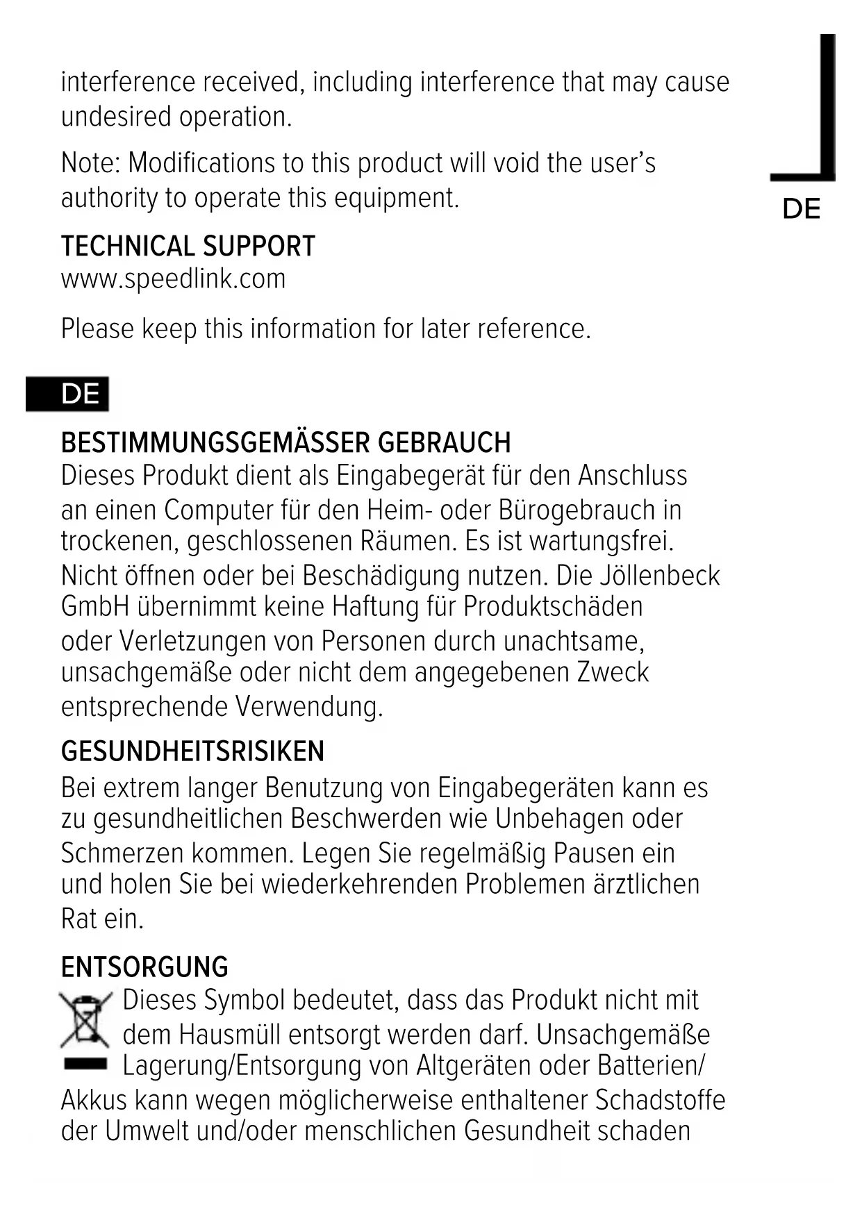 Dieses Produkt dient als Eingabegerät für den Anschluss an einen Computer für den Heim- oder Bürogebrauch in trockenen, geschlossenen Räumen. Es ist wartungsfrei. Nicht önen oder bei Beschädigung nutzen. Die Jöllenbeck GmbH übernimmt keine Haftung für Produktschäden oder Verletzungen von Personen durch unachtsame, unsachgemäße oder nicht dem angegebenen Zweck entsprechende Verwendung. GESUNDHEITSRISIKEN Bei extrem langer Benutzung von Eingabegeräten kann es zu gesundheitlichen Beschwerden wie Unbehagen oder Schmerzen kommen. Legen Sie regelmäßig Pausen ein und holen Sie bei wiederkehrenden Problemen ärztlichen Rat ein. ENTSORGUNG Dieses Symbol bedeutet, dass das Produkt nicht mit dem Hausmüll entsorgt werden darf. Unsachgemäße Lagerung/Entsorgung von Altgeräten oder Batterien/ Akkus kann wegen möglicherweise enthaltener Schadstoe der Umwelt und/oder menschlichen Gesundheit schadenund zu Sanktionen gemäß der Gesetzgebung führen. Die Abgabe bei einer oziellen Sammelstelle ist kostenlos und gesetzlich vorgeschrieben, stellt die korrekte Entsorgung oder Verwertung/ Wiederverwendung sicher und leistet einen Beitrag zum Umweltschutz. Auskunft erteilen Behörden, Wertstohöfe oder Fachgeschäfte. Große Händler (Elektrogeräte-Verkaufsfläche ≥ 400 m²) nehmen Kleingeräte (alle Maße < 25 cm) kostenlos an, andere nur bei Kauf gleichwertiger Produkte. Batterien/Akkus möglichst entnehmen. KONFORMITÄTSHINWEIS Unter Einwirkung von starken statischen, elektrischen oder hochfrequenten Feldern (Funkanlagen, Mobiltelefonen, Mikrowellen-Entladungen) kann es zu Funktionsbeeinträchtigungen des Gerätes (der Geräte) kommen. Versuchen Sie in diesem Fall, die Distanz zu den störenden Geräten zu vergrößern. TECHNISCHER SUPPORT www.speedlink.com Bitte bewahren Sie diese Information zur künftigen Verwendung auf.