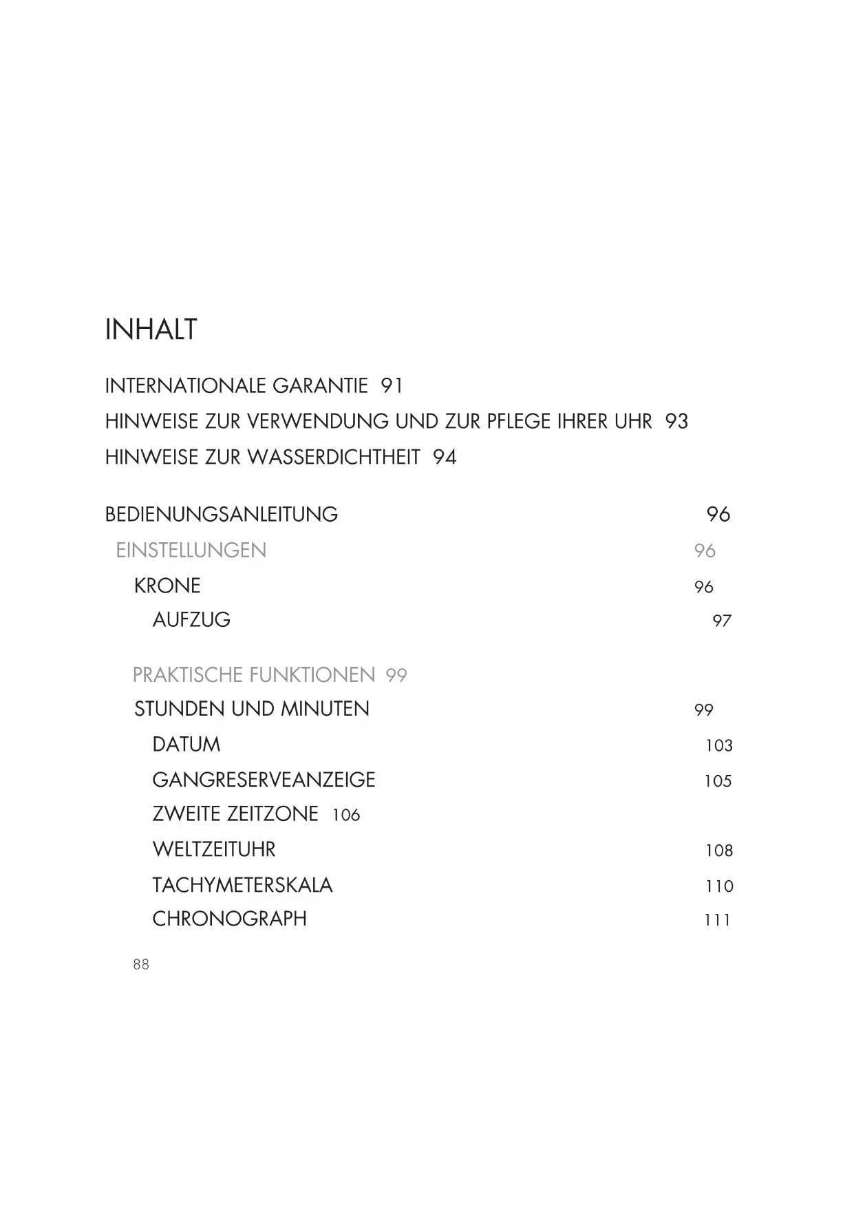 BEDIENUNGSANLEITUNG 96 EINSTELLUNGEN 96 KRONE 96 AUFZUG 97 PRAKTISCHE FUNKTIONEN 99