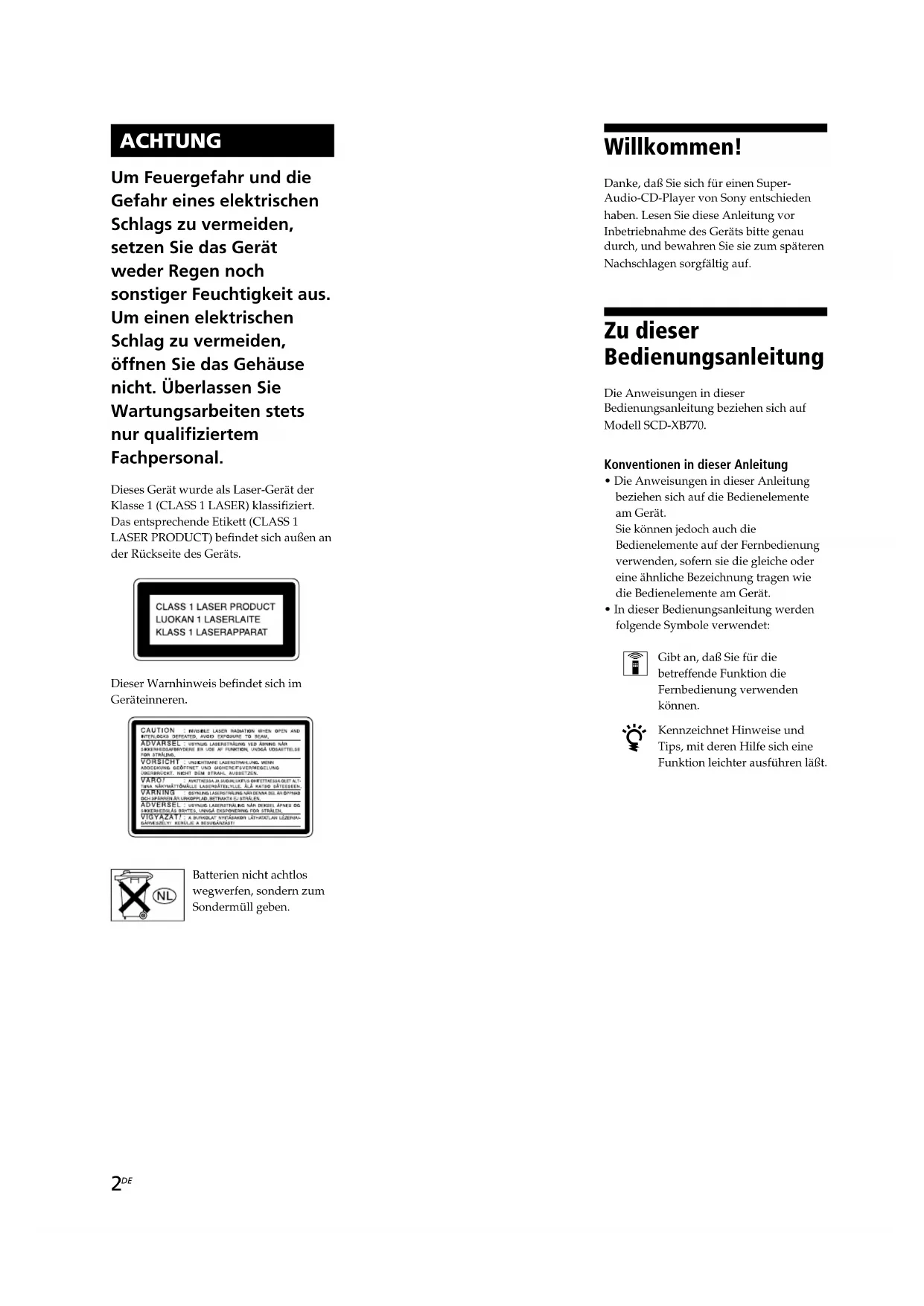 Danke, daß Sie sich für einen SuperAudio-CD-Player von Sony entschieden haben. Lesen Sie diese Anleitung vor Inbetriebnahme des Gerätsitte genau durch, und bewahren Sie sie zum späteren Nachschlagen sorgfältig auf.