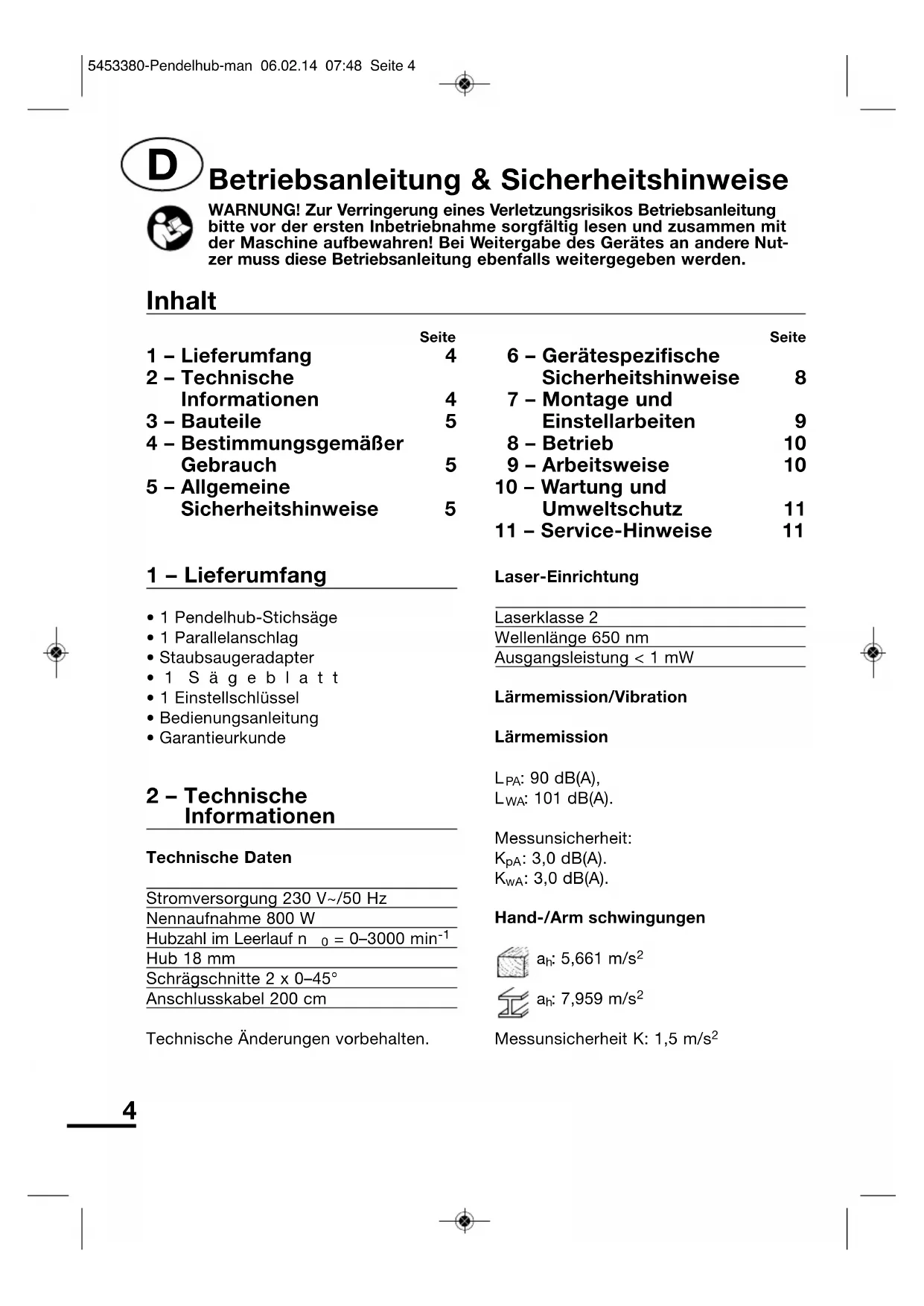 - 1 Pendelhub-Stichsäge• 1 Parallelanschlag• Staubsaugeradapter•1 Sägeblatt• 1 Einstellschlüssel• Bedienungsanleitung• Garantieurkunde 2 – Technische Informationen Technische DatenStromversorgung 230 V~/50 HzNennaufnahme 800 WHubzahl im Leerlauf n = 0–3000 min Hub 18 mmSchrägschnitte 2 x 0–45°Anschlusskabel 200 cmTechnische Änderungen vorbehalten.Laser-EinrichtungLaserklasse 2Wellenlänge 650 nmAusgangsleistung < 1 mWLärmemission/Vibration Lärmemission