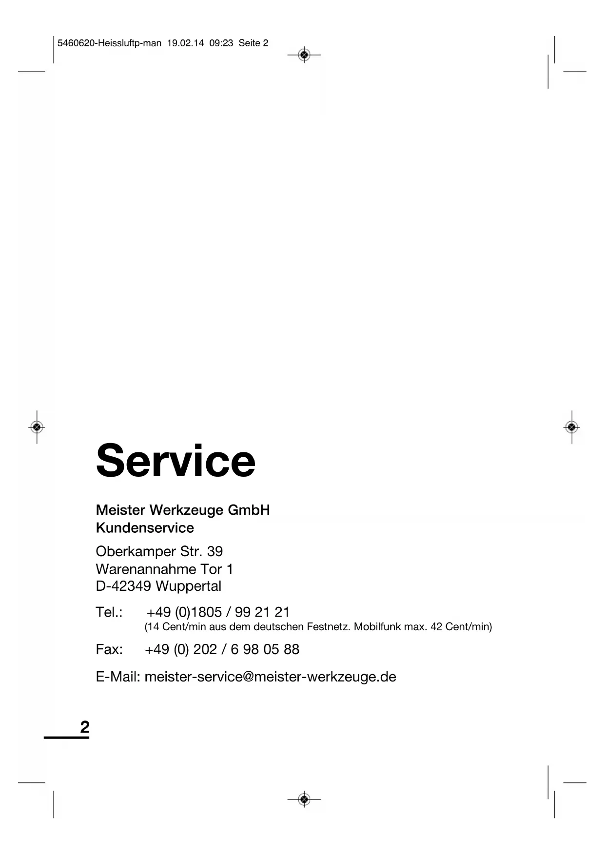 5460620-Heissluftp-man 19.02.14 09:23 Seite 5354 5460620-Heissluftp-man 19.02.14 09:23 Seite 5455 5460620-Heissluftp-man 19.02.14 09:23 Seite 55© Copyright Nachdruck oder Vervielfältigung – auch aus - zugs weise – nur mit Genehmigung der Meister Werkzeuge GmbH Oberkamper Str. 37– 39 D-42349 Wuppertal Germany 2014/2015 Diese Druckschrift einschließlich aller ihrer Teile ist urheberrechtlich geschützt. Jede Verwertung außerhalb der engen Grenzen des Urheberrechtsgesetzes ist ohne Zustim mung der Meister Werkzeuge GmbH unzu lässig und strafbar. Das gilt insbesondere für Vervielfältigungen, Übersetzungen, Mikroverfilmungen und die Ein speisung und Verarbeitung in elektronischen Systemen. 5460620-Heissluftp-man 19.02.14 09:23 Seite 56
