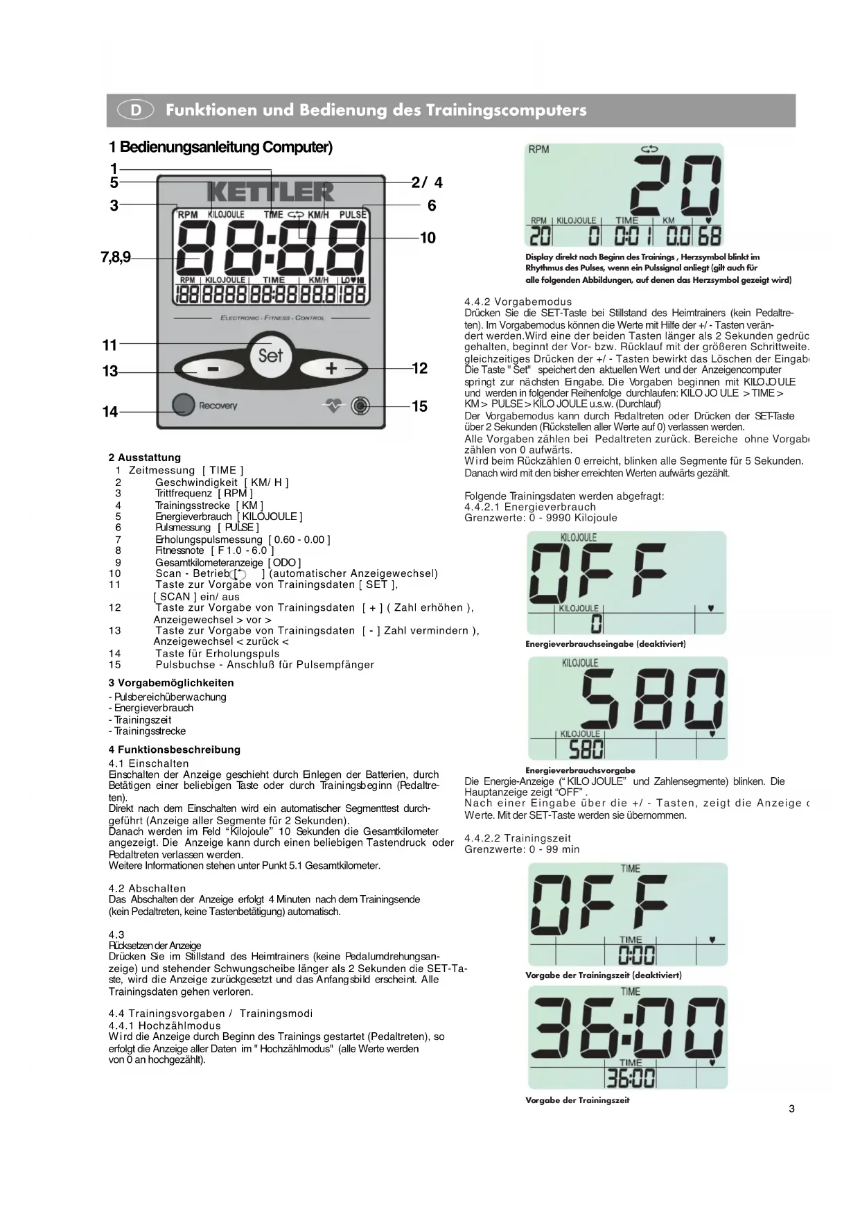1 Bedienungsanleitung Computer) 2 Ausstattung 1 Zeitmessung [ TIME ] 2 Geschwindigkeit [ KM/ H ] 3Trittfrequenz [ RPM ] 4Trainingsstrecke [ KM ] 5Energieverbrauch [ KILOJOULE ] 6 Pu l sm e ss u n g [ PU LSE ] 7Erholungspulsmessung [ 0.60 - 0.00 ] 8 Fi t ne ssno te [ F 1 . 0 - 6 . 0 ] 9Gesamtkilometeranzeige [ ODO ] 10 Scan - Betrieb [ ] (automatischer Anzeigewechsel) 11 Taste zur Vorgabe von Trainingsdaten [ SET ], [ SCAN ] ein/ aus 12 Taste zur Vorgabe von Trainingsdaten [ + ] ( Zahl erhöhen ), Anzeigewechsel > vor > 13 Taste zur Vorgabe von Trainingsdaten [ - ] Zahl vermindern ), Anzeigewechsel < zurück < 14 Taste für Erholungspuls 15 Pulsbuchse - Anschluß für Pulsempfänger 3 Vorgabemöglichkeiten - Pul sb er ei c hüb er w a c hung - Ener g i ever b ra uch - Tr a i ni ng sz ei t - Tr a i ni ng sstr ecke 4 Funktionsbeschreibung