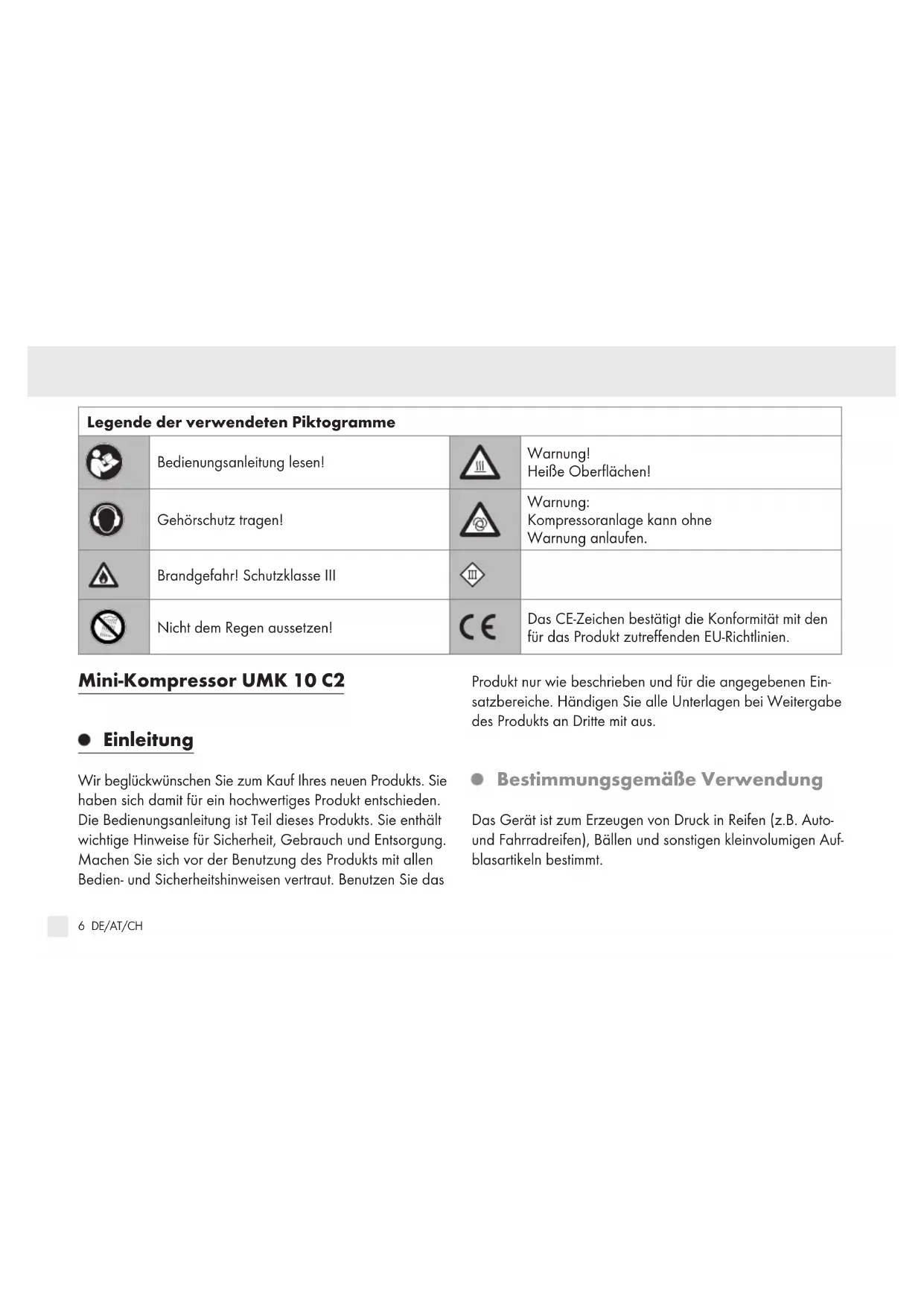 5 DE/AT/CH Legende der verwendeten Piktogramme......................................................................................... Seite 6 Einleitung....................................................................................................................................................................... Seite 6 Bestimmungsgemäße Verwendung.................................................................................................................................. Seite 6 Lieferumfang/Zubehör..................................................................................................................................................... Seite 7 Übersicht............................................................................................................................................................................ Seite 7 Technische Daten.............................................................................................................................................................. Seite 8 Allgemeine Sicherheitshinweise für Elektrowerkzeuge....................................................... Seite 8 Bedienung .................................................................................................................................................................... Seite 17 Inbetriebnahme ................................................................................................................................................................. Seite 17 Arbeitshinweise ................................................................................................................................................................. Seite 18 Luftdruck prüfen................................................................................................................................................................. Seite 19 Überlastsicherung ............................................................................................................................................................. Seite 19 Reinigung...................................................................................................................................................................... Seite 19 Wartung......................................................................................................................................................................... Seite 20 Aufbewahrung......................................................................................................................................................... Seite 20 Entsorgung................................................................................................................................................................... Seite 20 Garantie......................................................................................................................................................................... Seite 21 Abwicklung im Garantiefall.............................................................................................................................................. Seite 21 Service ............................................................................................................................................................................... Seite 22 EU Konformitätserklärung............................................................................................................................. Seite 22 V3.0 383683_2110_V3.0_uls_Mini-Kompressor UMK 10 C2_Content_OS.indd 5 21.01.22 09:416 DE/AT/CH Legende der verwendeten Piktogramme Bedienungsanleitung lesen! Warnung! Heiße Oberflächen! Gehörschutz tragen! Warnung: Kompressoranlage kann ohne Warnung anlaufen. Brandgefahr! Schutzklasse III Nicht dem Regen aussetzen! Das CE-Zeichen bestätigt die Konformität mit den für das Produkt zutreffenden EU-Richtlinien. Mini-Kompressor UMK 10 C2 Einleitung Wir beglückwünschen Sie zum Kauf Ihres neuen Produkts. Sie haben sich damit für ein hochwertiges Produkt entschieden. Die Bedienungsanleitung ist Teil dieses Produkts. Sie enthält wichtige Hinweise für Sicherheit, Gebrauch und Entsorgung. Machen Sie sich vor der Benutzung des Produkts mit allen Bedien- und Sicherheitshinweisen vertraut. Benutzen Sie das Produkt nur wie beschrieben und für die angegebenen Ein- satzbereiche. Händigen Sie alle Unterlagen bei Weitergabe des Produkts an Dritte mit aus. Bestimmungsgemäße Verwendung Das Gerät ist zum Erzeugen von Druck in Reifen (z.B. Auto- und Fahrradreifen), Bällen und sonstigen kleinvolumigen Auf- blasartikeln bestimmt. 383683_2110_V3.0_uls_Mini-Kompressor UMK 10 C2_Content_OS.indd 6 21.01.22 09:417 DE/AT/CH Dieses Gerät ist nicht für den Dauerbetrieb geeignet. Benutzen Sie das Gerät nicht länger als 5 Minuten. Jede andere Verwendung kann zu Schäden am Gerät führen und eine ernsthafte Gefahr für den Benutzer darstellen. Der Hersteller haftet nicht für Schäden, die durch bestimmungs- widrigen Gebrauch oder falsche Bedienung verursacht wurden. Dieses Gerät ist nicht zur gewerblichen Nutzung geeignet. Bei gewerblichem Einsatz erlischt die Garantie. Lieferumfang /Zubehör Packen Sie das Gerät aus und kontrollieren Sie, ob es voll- ständig ist: 1 Minikompressor 4 Ventiladapter 1 Betriebsanleitung Entsorgen Sie das Verpackungsmaterial ordnungsgemäß. Übersicht