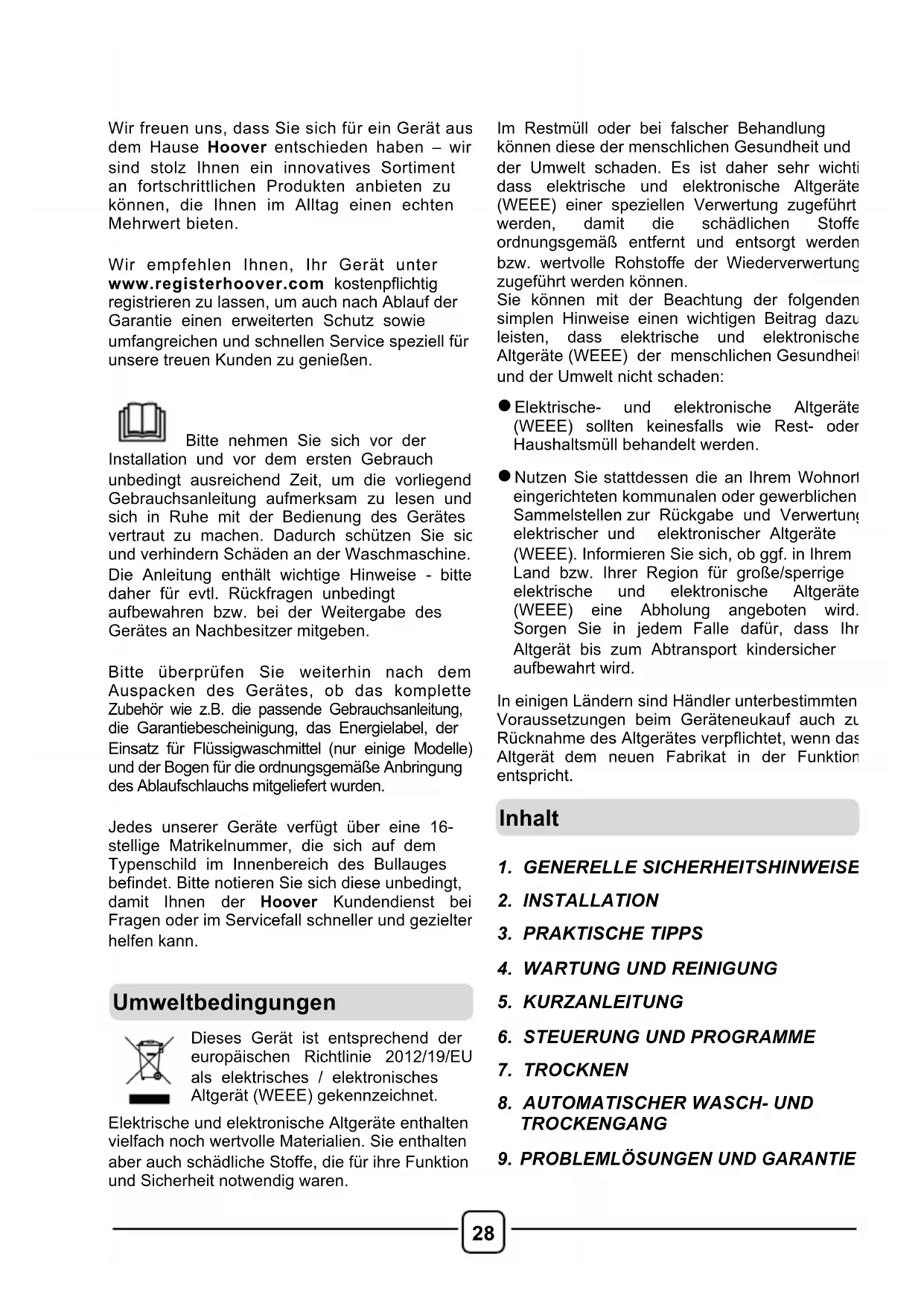 Wir freuen uns, dass Sie sich für ein Gerät aus dem Hause Hoover entschieden haben – wir sind stolz Ihnen ein innovatives Sortiment an fortschrittlichen Produkten anbieten zu können, die Ihnen im Alltag einen echten Mehrwert bieten. Wir empfehlen Ihnen, Ihr Gerät unter www.registerhoover.com kostenpflichtig registrieren zu lassen, um auch nach Ablauf der Garantie einen erweiterten Schutz sowie umfangreichen und schnellen Service speziell für unsere treuen Kunden zu genießen. Bitte nehmen Sie sich vor der Installation und vor dem ersten Gebrauch unbedingt ausreichend Zeit, um die vorliegende Gebrauchsanleitung aufmerksam zu lesen und sich in Ruhe mit der Bedienung des Gerätes vertraut zu machen. Dadurch schützen Sie sich und verhindern Schäden an der Waschmaschine. Die Anleitung enthält wichtige Hinweise - bitte daher für evtl. Rückfragen unbedingt aufbewahren bzw. bei der Weitergabe des Gerätes an Nachbesitzer mitgeben. Bitte überprüfen Sie weiterhin nach dem Auspacken des Gerätes, ob das komplette Zubehör wie z.B. die passende Gebrauchsanleitung, die Garantiebescheinigung, das Energielabel, der Einsatz für Flüssigwaschmittel (nur einige Modelle) und der Bogen für die ordnungsgemäße Anbringung des Ablaufschlauchs mitgeliefert wurden. Jedes unserer Geräte verfügt über eine 16-stellige Matrikelnummer, die sich auf dem Typenschild im Innenbereich des Bullauges befindet. Bitte notieren Sie sich diese unbedingt, damit Ihnen der Hoover Kundendienst bei Fragen oder im Servicefall schneller und gezielter helfen kann.