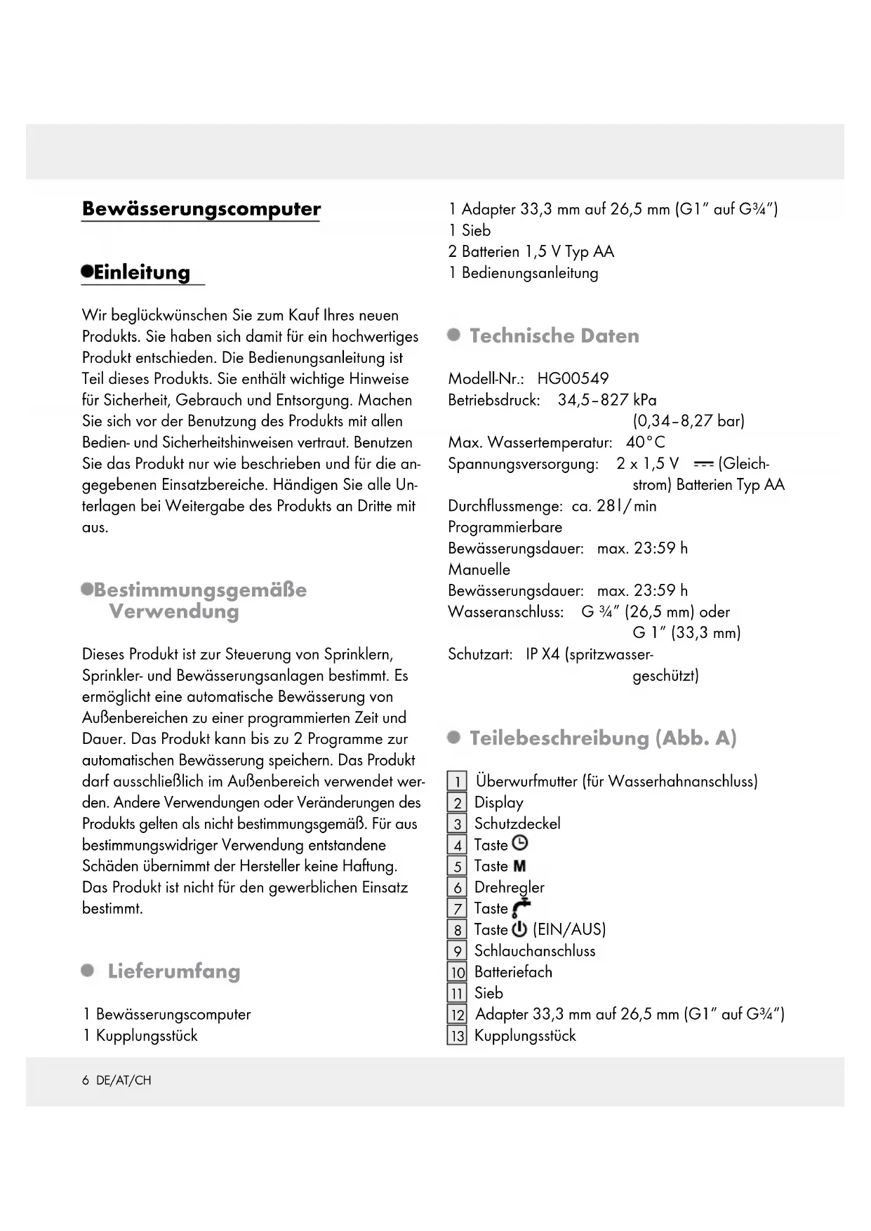 ca./approx./env. 2 Sec. ca./approx./env 2 Sec. ca./approx./env. 2 Sec.5 DE/AT/CH Einleitung ............................................................................................................................................Seite 6 Bestimmungsgemäße Verwendung .......................................................................................................Seite 6 Lieferumfang ...........................................................................................................................................Seite 6 Technische Daten ...................................................................................................................................Seite 6 Teilebeschreibung ..................................................................................................................................Seite 6 Displayanzeigen ....................................................................................................................................Seite 7 Sicherheit ............................................................................................................................................Seite 7 Sicherheitshinweise ................................................................................................................................Seite 7 Sicherheitshinweise für Batterien / Akkus ..............................................................................................Seite 8 Batterien einlegen / wechseln ...........................................................................................Seite 10 Inbetriebnahme ............................................................................................................................Seite 10 Betrieb ..................................................................................................................................................Seite 10 Produkt ein- / ausschalten ......................................................................................................................Seite 11 Uhrzeit einstellen ....................................................................................................................................Seite 11 Bewässerung 1 und 2, Intervall programmieren..................................................................................Seite 11 Manuelle Bewässerung .........................................................................................................................Seite 12 Anzeige Batteriezustand ......................................................................................................Seite 12 Fehlerbehebung ...........................................................................................................................Seite 12 Reinigung und Pflege ...............................................................................................................Seite 13 Sieb reinigen ..........................................................................................................................................Seite 13 Lagerung ............................................................................................................................................Seite 13 Entsorgung ........................................................................................................................................Seite 13 Garantie ..............................................................................................................................................Seite 146 DE/AT/CH Bewässerungscomputer Einleitung Wir beglückwünschen Sie zum Kauf Ihres neuen Produkts. Sie haben sich damit für ein hochwertiges Produkt entschieden. Die Bedienungsanleitung ist Teil dieses Produkts. Sie enthält wichtige Hinweise für Sicherheit, Gebrauch und Entsorgung. Machen Sie sich vor der Benutzung des Produkts mit allen Bedien- und Sicherheitshinweisen vertraut. Benutzen Sie das Produkt nur wie beschrieben und für die an- gegebenen Einsatzbereiche. Händigen Sie alle Un- terlagen bei Weitergabe des Produkts an Dritte mit aus. Bestimmungsgemäße Verwendung Dieses Produkt ist zur Steuerung von Sprinklern, Sprinkler- und Bewässerungsanlagen bestimmt. Es ermöglicht eine automatische Bewässerung von Außenbereichen zu einer programmierten Zeit und Dauer. Das Produkt kann bis zu 2 Programme zur automatischen Bewässerung speichern. Das Produkt darf ausschließlich im Außenbereich verwendet wer- den. Andere Verwendungen oder Veränderungen des Produkts gelten als nicht bestimmungsgemäß. Für aus bestimmungswidriger Verwendung entstandene Schäden übernimmt der Hersteller keine Haftung. Das Produkt ist nicht für den gewerblichen Einsatz bestimmt. Lieferumfang 1 Bewässerungscomputer 1 Kupplungsstück 1 Adapter 33,3 mm auf 26,5 mm (G1” auf G¾”) 1 Sieb 2 Batterien 1,5 V Typ AA 1 Bedienungsanleitung Technische Daten Modell-Nr.: HG00549 Betriebsdruck: 34,5–827 kPa (0,34–8,27 bar) Max. Wassertemperatur: 40°C Spannungsversorgung: 2 x 1,5 V (Gleich- strom) Batterien Typ AA Durchflussmenge: ca. 28 l / min Programmierbare Bewässerungsdauer: max. 23:59 h Manuelle Bewässerungsdauer: max. 23:59 h Wasseranschluss: G ¾” (26,5 mm) oder G 1” (33,3 mm) Schutzart: IP X4 (spritzwasser- geschützt) Teilebeschreibung (Abb. A)