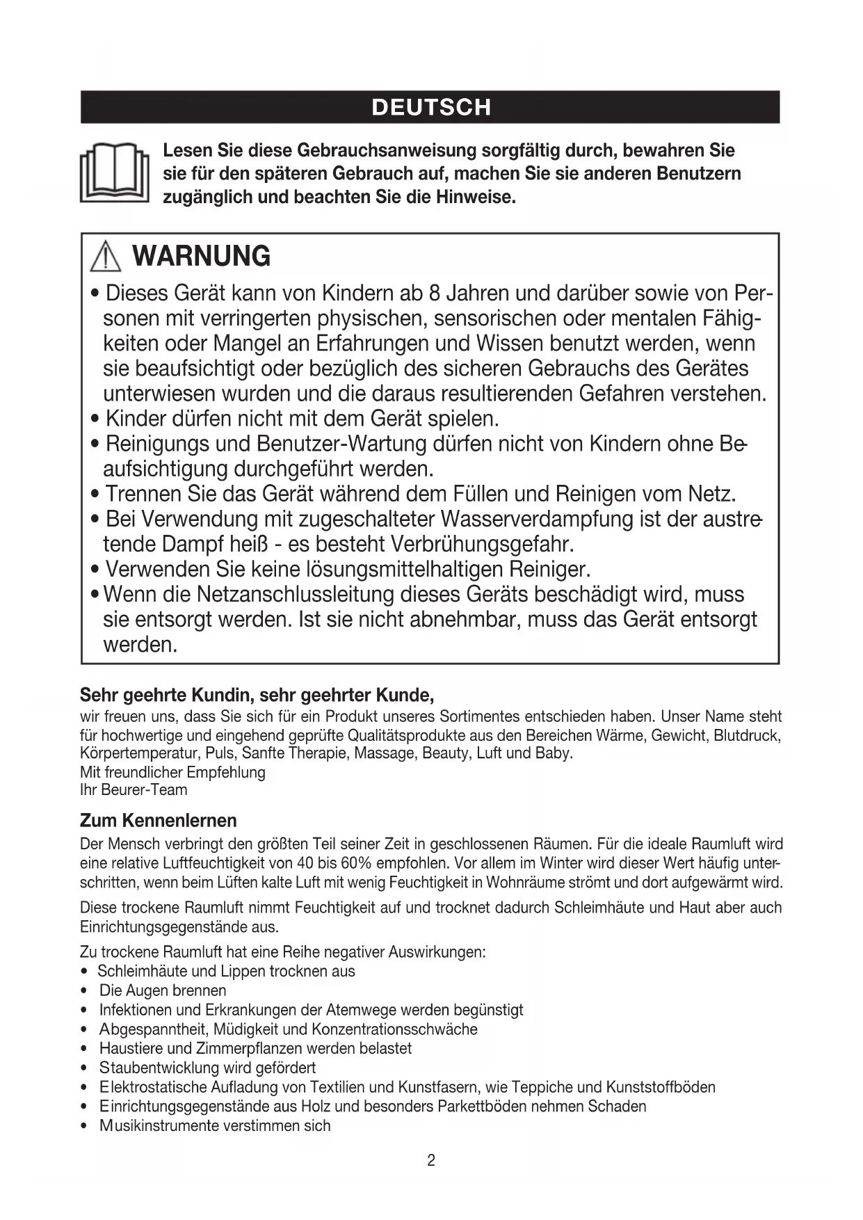 - Wenn die Netzanschlussleitung dieses Geräts beschädigt wird, muss sie entsorgt werden. Ist sie nicht abnehmbar, muss das Gerät entsorgt werden. Sehr geehrte Kundin, sehr geehrter Kunde, wir freuen uns, dass Sie sich für ein Produkt unseres Sortimentes entschieden haben. Unser Name steht für hochwertige und eingehend geprüfte Qualitätsprodukte aus den Bereichen Wärme, Gewicht, Blutdruck, Körpertemperatur, Puls, Sanfte Therapie, Massage, Beauty, Luft und Baby. Mit freundlicher Empfehlung Ihr Beurer-Team Zum Kennenlernen Der Mensch verbringt den größten Teil seiner Zeit in geschlossenen Räumen. Für die ideale Raumluft wird eine relative Luftfeuchtigkeit von 40 bis 60% empfohlen. Vor allem im Winter wird dieser Wert häufig unter