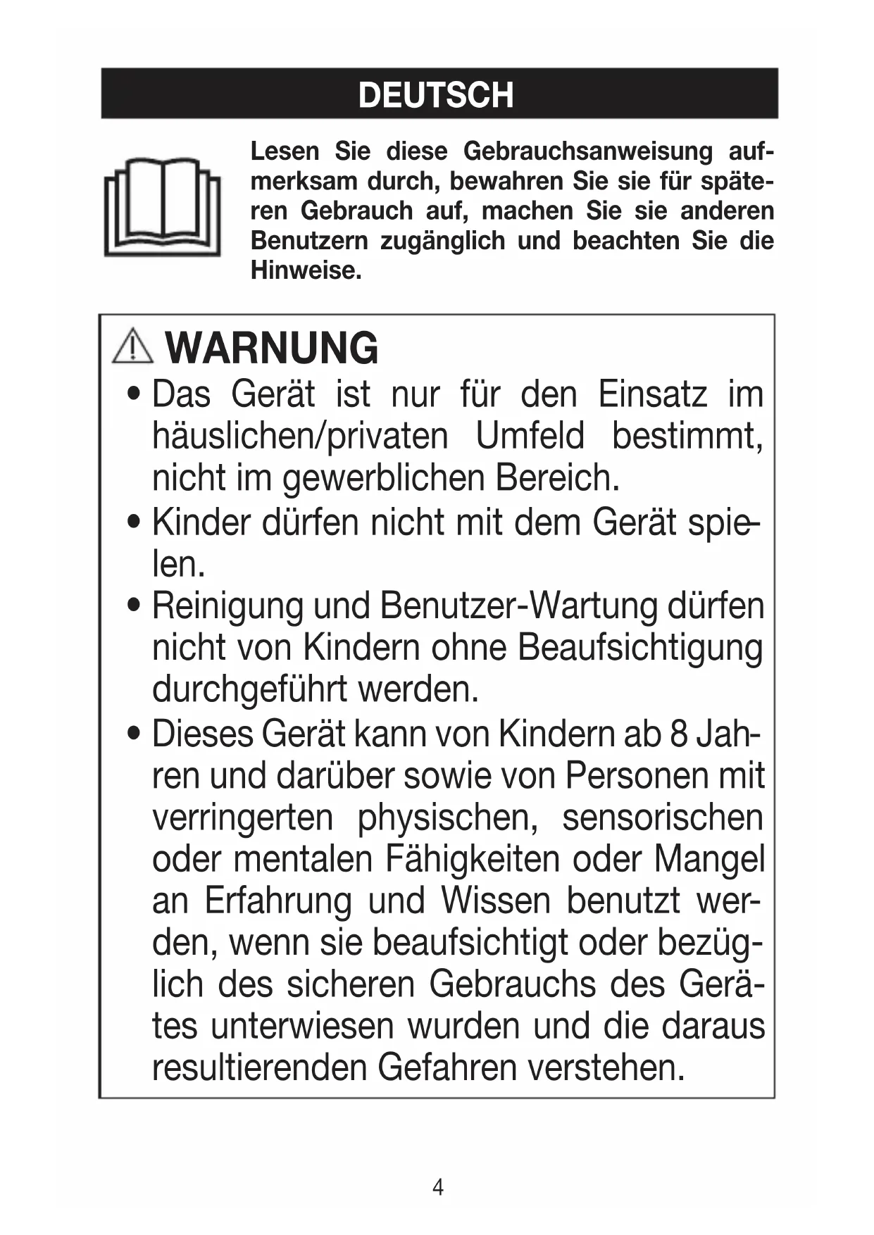 - Das Gerät ist nur für den Einsatz im häuslichen/privaten Umfeld bestimmt, nicht im gewerblichen Bereich.