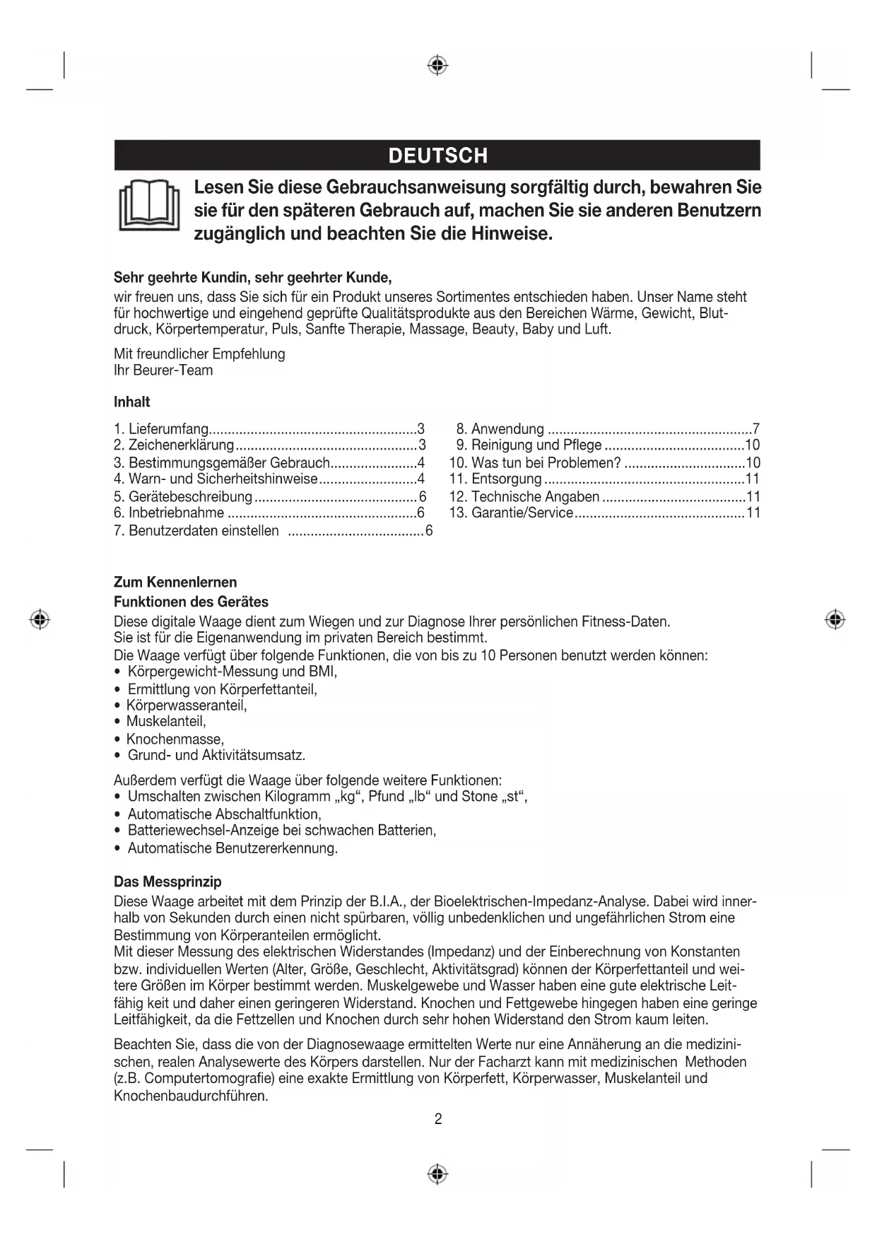 - Automatische Benutzererkennung. Das Messprinzip Diese Waage arbeitet mit dem Prinzip der B.I.A., der Bioelektrischen-Impedanz-Analyse. Dabei wird inner- halb von Sekunden durch einen nicht spürbaren, völlig unbedenklichen und ungefährlichen Strom eine Bestimmung von Körperanteilen ermöglicht. Mit dieser Messung des elektrischen Widerstandes (Impedanz) und der Einberechnung von Konstanten bzw. individuellen Werten (Alter, Größe, Geschlecht, Aktivitätsgrad) können der Körperfettanteil und wei- tere Größen im Körper bestimmt werden. Muskelgewebe und Wasser haben eine gute elektrische Leit- fähig keit und daher einen geringeren Widerstand. Knochen und Fettgewebe hingegen haben eine geringe Leitfähigkeit, da die Fettzellen und Knochen durch sehr hohen Widerstand den Strom kaum leiten. Beachten Sie, dass die von der Diagnosewaage ermittelten Werte nur eine Annäherung an die medizini- schen, realen Analysewerte des Körpers darstellen. Nur der Facharzt kann mit medizinischen Methoden (z.B. Computertomografie) eine exakte Ermittlung von Körperfett, Körperwasser, Muskelanteil und Knochen bau durchführen. Lesen Sie diese Gebrauchsanweisung sorgfältig durch, bewahren Sie sie für den späteren Gebrauch auf, machen Sie sie anderen Benutzern zugänglich und beachten Sie die Hinweise. Sehr geehrte Kundin, sehr geehrter Kunde, wir freuen uns, dass Sie sich für ein Produkt unseres Sortimentes entschieden haben. Unser Name steht für hochwertige und eingehend geprüfte Qualitätsprodukte aus den Bereichen Wärme, Gewicht, Blut- druck, Körpertemperatur, Puls, Sanfte Therapie, Massage, Beauty, Baby und Luft. Mit freundlicher Empfehlung Ihr Beurer-Team Inhalt3