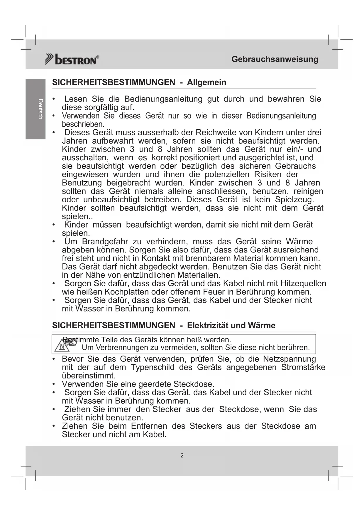 KUNDENDIENST Sollte unerwartet eine Störung auftreten dann können Sie sich mit dem BESTRON-Kundendienst in Verbindung setzen: www.bestron.com/service