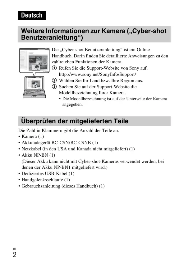 Deutsch Weitere Informationen zur Kamera („Cyber-shot Benutzeranleitung“) Die „Cyber-shot Benutzeranleitung“ ist ein OnlineHandbuch. Darin finden Sie detaillierte Anweisungen zu den zahlreichen Funktionen der Kamera. 1 Rufen Sie die Support-Website von Sony auf. http://www.sony.net/SonyInfo/Support/ 2 Wählen Sie Ihr Land bzw. Ihre Region aus. 3 Suchen Sie auf der Support-Website die Modellbezeichnung Ihrer Kamera.