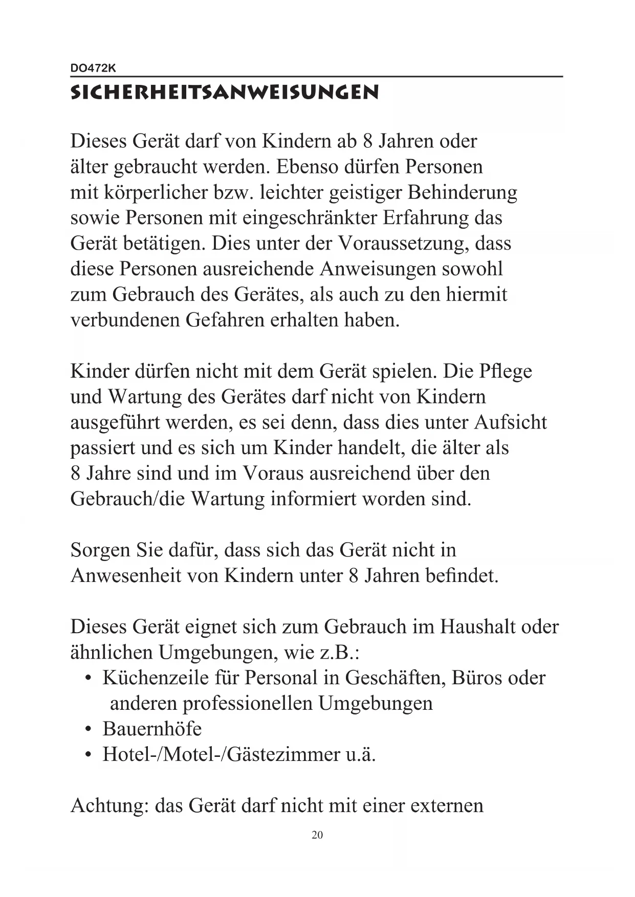 - Hotel-/Motel-/Gästezimmer u.ä. Achtung: das Gerät darf nicht mit einer externenDO472K