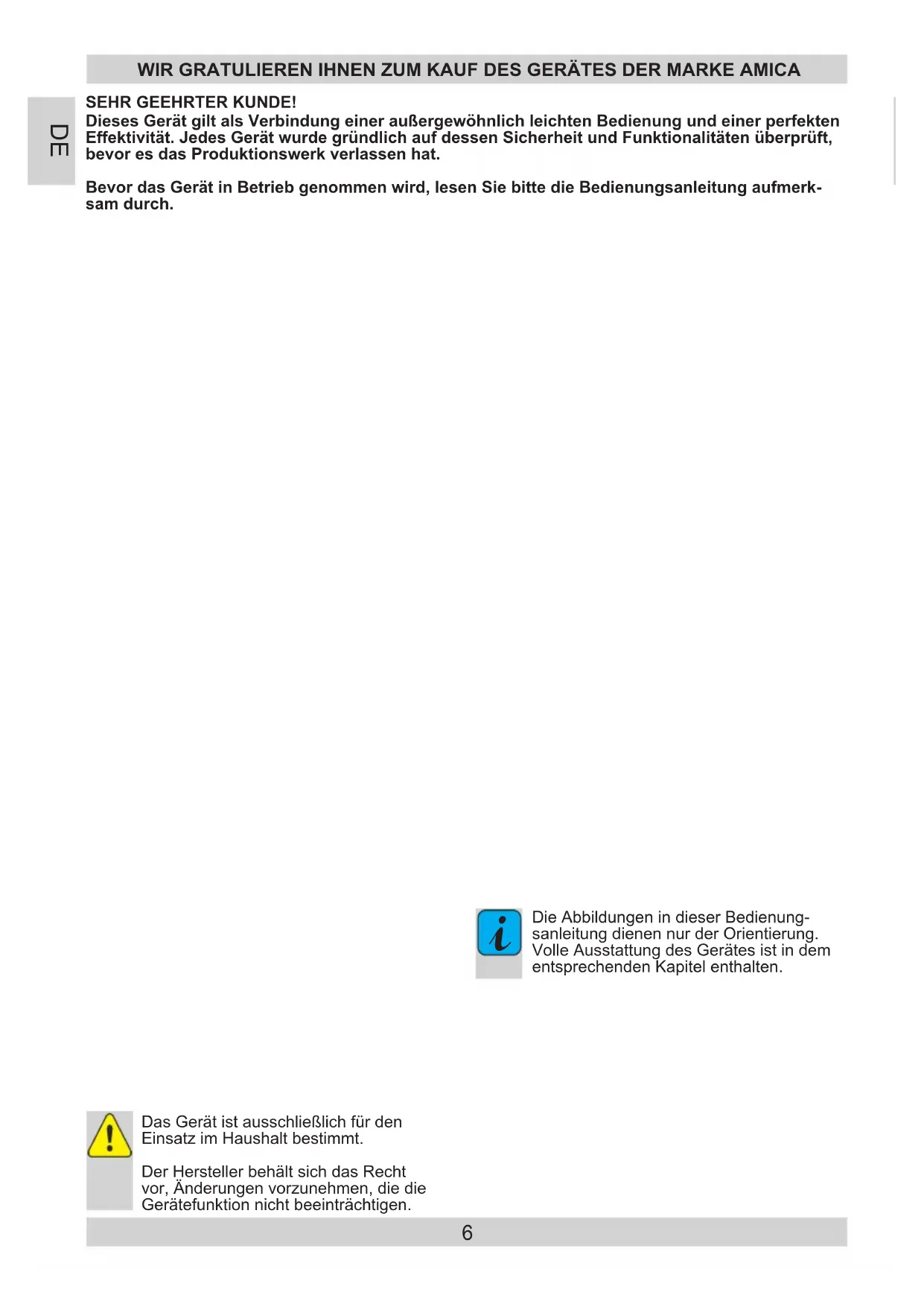 Die Abbildungen in dieser Bedienung- sanleitung dienen nur der Orientierung. Volle Ausstattung des Gerätes ist in dem entsprechenden Kapitel enthalten. Dieses Gerät gilt als Verbindung einer außergewöhnlich leichten Bedienung und einer perfekten Effektivität. Jedes Gerät wurde gründlich auf dessen Sicherheit und Funktionalitäten überprüft, bevor es das Produktionswerk verlassen hat. Bevor das Gerät in Betrieb genommen wird, lesen Sie bitte die Bedienungsanleitung aufmerk- sam durch. SEHR GEEHRTER KUNDE! WIR GRATULIEREN IHNEN ZUM KAUF DES GERÄTES DER MARKE AMICA DE7 SICHERHEITSHINWEISE