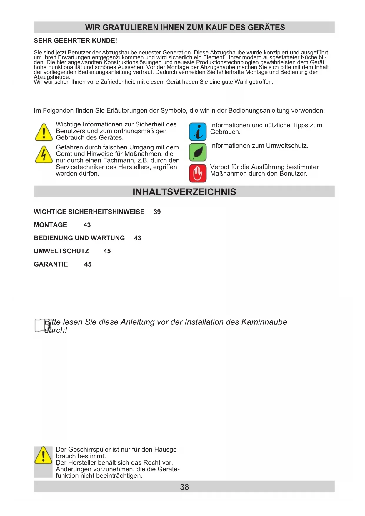 Informationen zum Umweltschutz. Der Geschirrspüler ist nur für den Hausge- brauch bestimmt. Der Hersteller behält sich das Recht vor, Änderungen vorzunehmen, die die Geräte- funktion nicht beeinträchtigen. BittelesenSiedieseAnleitungvorderInstallationdesKaminhaube durch!39 WICHTIGE SICHERHEITSHINWEISE
