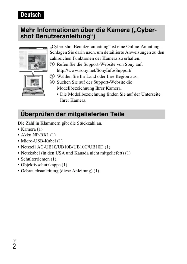 Deutsch Mehr Informationen über die Kamera („Cybershot Benutzeranleitung“) „Cyber-shot Benutzeranleitung“ ist eine Online-Anleitung. Schlagen Sie darin nach, um detaillierte Anweisungen zu den zahlreichen Funktionen der Kamera zu erhalten. 1 Rufen Sie die Support-Website von Sony auf. http://www.sony.net/SonyInfo/Support/ 2 Wählen Sie Ihr Land oder Ihre Region aus. 3 Suchen Sie auf der Support-Website die Modellbezeichnung Ihrer Kamera.
