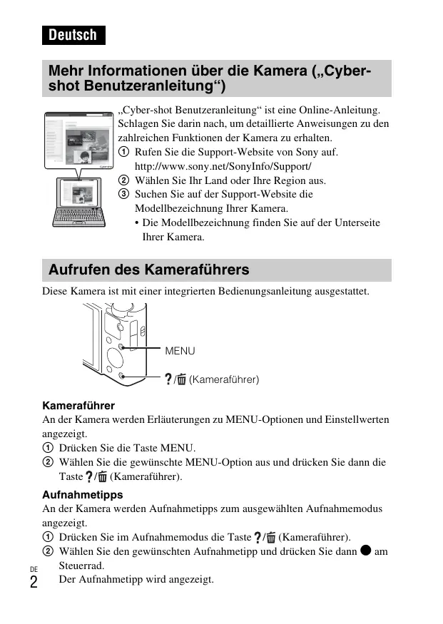 Deutsch Mehr Informationen über die Kamera („Cybershot Benutzeranleitung“) „Cyber-shot Benutzeranleitung“ ist eine Online-Anleitung. Schlagen Sie darin nach, um detaillierte Anweisungen zu den zahlreichen Funktionen der Kamera zu erhalten. 1 Rufen Sie die Support-Website von Sony auf. http://www.sony.net/SonyInfo/Support/ 2 Wählen Sie Ihr Land oder Ihre Region aus. 3 Suchen Sie auf der Support-Website die Modellbezeichnung Ihrer Kamera.