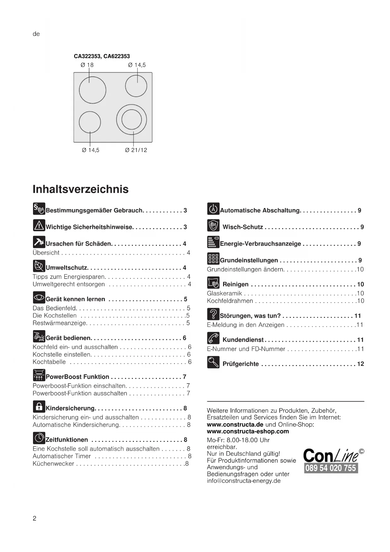 - Gerät kennen lernen . . . . . . . . . . . . . . . . . . . . . . 5 Das Bedienfeld. . . . . . . . . . . . . . . . . . . . . . . . . . . . . . . 5 Die Kochstellen . . . . . . . . . . . . . . . . . . . . . . . . . . . . . .5 Restwärmeanzeige. . . . . . . . . . . . . . . . . . . . . . . . . . . . 5 1 Gerät bedienen. . . . . . . . . . . . . . . . . . . . . . . . . . . 6 Kochfeld ein- und ausschalten . . . . . . . . . . . . . . . . . . . 6 Kochstelle einstellen. . . . . . . . . . . . . . . . . . . . . . . . . . . 6 Kochtabelle . . . . . . . . . . . . . . . . . . . . . . . . . . . . . . . . . 6 v PowerBoost Funktion . . . . . . . . . . . . . . . . . . . . . 7 Powerboost-Funktion einschalten. . . . . . . . . . . . . . . . . 7 Powerboost-Funktion ausschalten . . . . . . . . . . . . . . . . 7 A Kindersicherung. . . . . . . . . . . . . . . . . . . . . . . . . . 8 Kindersicherung ein- und ausschalten . . . . . . . . . . . . . 8 Automatische Kindersicherung. . . . . . . . . . . . . . . . . . . 8 O Zeitfunktionen . . . . . . . . . . . . . . . . . . . . . . . . . . . 8 Eine Kochstelle soll automatisch ausschalten . . . . . . . 8 Automatischer Timer . . . . . . . . . . . . . . . . . . . . . . . . . . 8 Küchenwecker . . . . . . . . . . . . . . . . . . . . . . . . . . . . . . .8 b Automatische Abschaltung. . . . . . . . . . . . . . . . . 9 k Wisch-Schutz . . . . . . . . . . . . . . . . . . . . . . . . . . . . 9 [ Energie-Verbrauchsanzeige . . . . . . . . . . . . . . . . 9 Q Grundeinstellungen . . . . . . . . . . . . . . . . . . . . . . . 9 Grundeinstellungen ändern. . . . . . . . . . . . . . . . . . . . .10 D Reinigen . . . . . . . . . . . . . . . . . . . . . . . . . . . . . . . 10 Glaskeramik . . . . . . . . . . . . . . . . . . . . . . . . . . . . . . . .10 Kochfeldrahmen . . . . . . . . . . . . . . . . . . . . . . . . . . . . .10 3 Störungen, was tun? . . . . . . . . . . . . . . . . . . . . . 11 E-Meldung in den Anzeigen . . . . . . . . . . . . . . . . . . . .11 4 Kundendienst . . . . . . . . . . . . . . . . . . . . . . . . . . . 11 E-Nummer und FD-Nummer . . . . . . . . . . . . . . . . . . . .11 E Prüfgerichte . . . . . . . . . . . . . . . . . . . . . . . . . . . . 12 Produktinfo Weitere Informationen zu Produkten, Zubehör, Ersatzteilen und Services finden Sie im Internet: www.constructa.de und Online-Shop: www.constructa-eshop.com Mo-Fr: 8.00-18.00 Uhr erreichbar. Nur in Deutschland gültig! Für Produktinformationen sowie Anwendungs- und Bedienungsfragen oder unter info@constructa-energy.de