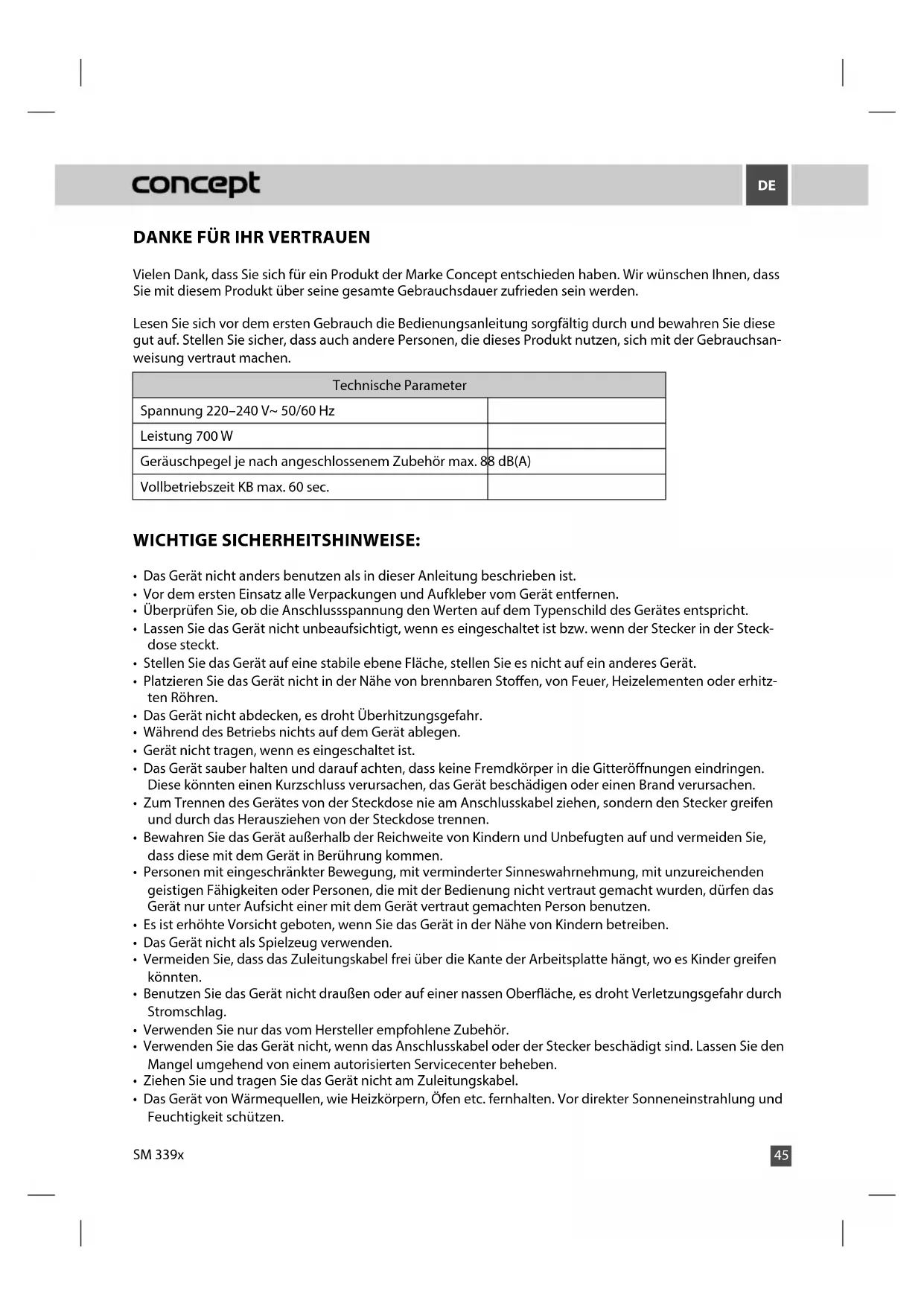 Vielen Dank, dass Sie sich für ein Produkt der Marke Concept entschieden haben. Wir wünschen Ihnen, dass Sie mit diesem Produkt über seine gesamte Gebrauchsdauer zufrieden sein werden. Lesen Sie sich vor dem ersten Gebrauch die Bedienungsanleitung sorgfältig durch und bewahren Sie diese gut auf. Stellen Sie sicher, dass auch andere Personen, die dieses Produkt nutzen, sich mit der Gebrauchsan- weisung vertraut machen. Technische Parameter Spannung 220–240 V~ 50/60 Hz Leistung 700 W Geräuschpegel je nach angeschlossenem Zubehör max. 88 dB(A) Vollbetriebszeit KB max. 60 sec. WICHTIGE SICHERHEITSHINWEISE: