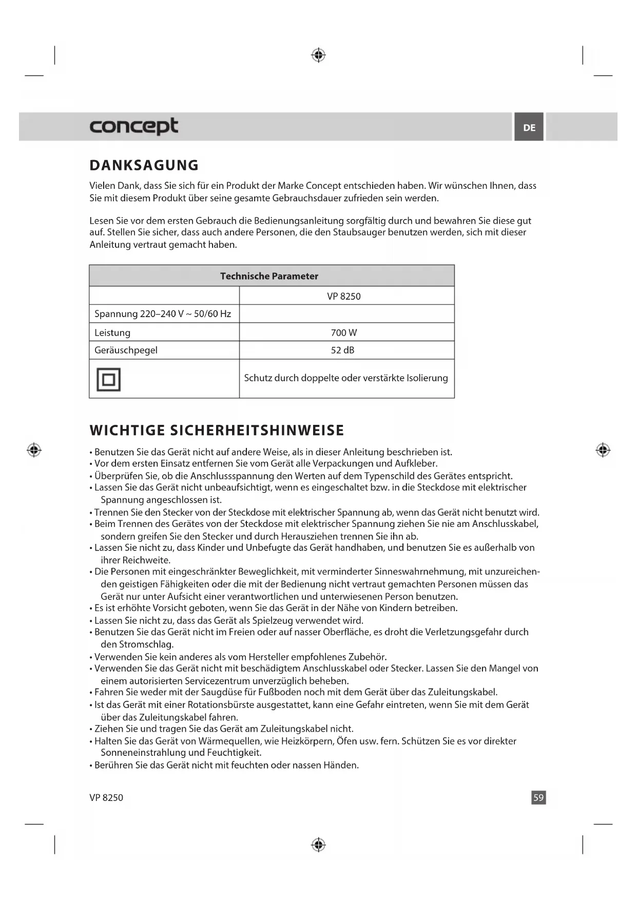 DANKSAGUNG Vielen Dank, dass Sie sich für ein Produkt der Marke Concept entschieden haben. Wir wünschen Ihnen, dass Sie mit diesem Produkt über seine gesamte Gebrauchsdauer zufrieden sein werden. Lesen Sie vor dem ersten Gebrauch die Bedienungsanleitung sorgfältig durch und bewahren Sie diese gut auf. Stellen Sie sicher, dass auch andere Personen, die den Staubsauger benutzen werden, sich mit dieser Anleitung vertraut gemacht haben. WICHTIGE SICHERHEITSHINWEISE