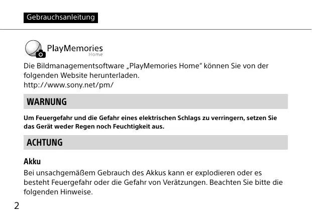 Gebrauchsanleitung Die Bildmanagementsoftware „PlayMemories Home“ können Sie von der folgenden Website herunterladen. http://www.sony.net/pm/ WARNUNG Um Feuergefahr und die Gefahr eines elektrischen Schlags zu verringern, setzen Sie das Gerät weder Regen noch Feuchtigkeit aus. ACHTUNG Akku Bei unsachgemäßem Gebrauch des Akkus kann er explodieren oder es besteht Feuergefahr oder die Gefahr von Verätzungen. Beachten Sie bitte die folgenden Hinweise.