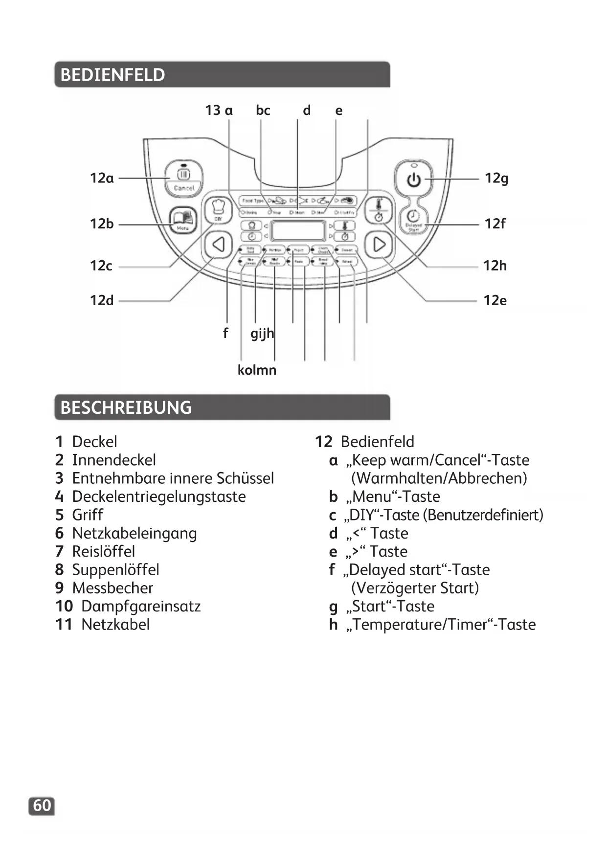 - Setzen Sie alle Elemente an ihren ursprünglichen Platz. Installieren Sie den Innendeckel in der richtigen Position am oberen Deckel des Gerätes. Positionieren Sie den Innendeckel dann hinter den zwei Rippen und drücken Sie darauf, bis er einrastet. Verbinden Sie das abnehmbare Kabel mit dem Netzkabeleingang an der Kocherbasis. 13 Funktionsanzeigen a Baking (Backen) b Soup (Suppe) c Steam (Dampfgaren) d Stew (Schmoren) e Crust/Fry (Kruste/Braten) f Baby food (Babynahrung) g Porridge (Haferbrei) h Yogurt (Joghurt) i Cream/Cheese/ (Frischkäse) j Dessert k Rice/Cereals (Reis/Zerealien) l Pilau/Risotto m Pasta (Nudeln) n Bread rising (Brotteig-Gärung) o Reheat (Aufwärmen)62 FÜR DAS GERÄT UND ALLE FUNKTIONEN
