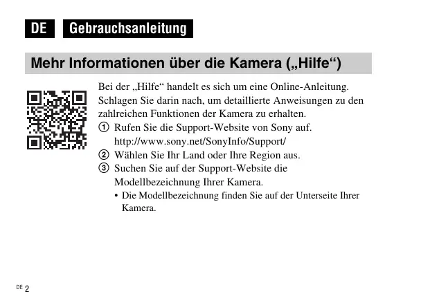 Gebrauchsanleitung Mehr Informationen über die Kamera („Hilfe“) Bei der „Hilfe“ handelt es sich um eine Online-Anleitung. Schlagen Sie darin nach, um detaillierte Anweisungen zu den zahlreichen Funktionen der Kamera zu erhalten. 1 Rufen Sie die Support-Website von Sony auf. http://www.sony.net/SonyInfo/Support/ 2 Wählen Sie Ihr Land oder Ihre Region aus. 3 Suchen Sie auf der Support-Website die Modellbezeichnung Ihrer Kamera.