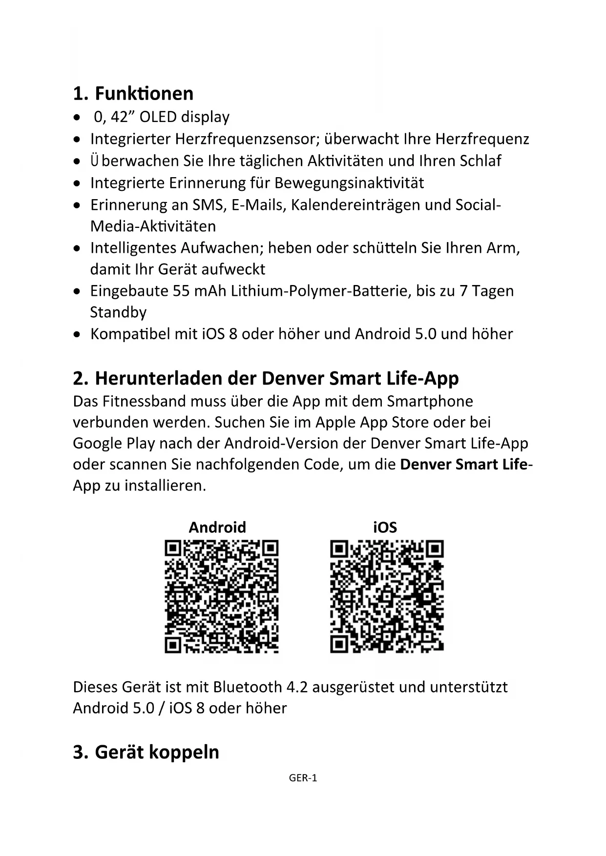 Das Fitnessband muss über die App mit dem Smartphone verbunden werden. Suchen Sie im Apple App Store oder bei Google Play nach der Android-Version der Denver Smart Life-App oder scannen Sie nachfolgenden Code, um die Denver Smart Life- App zu installieren. Android iOS