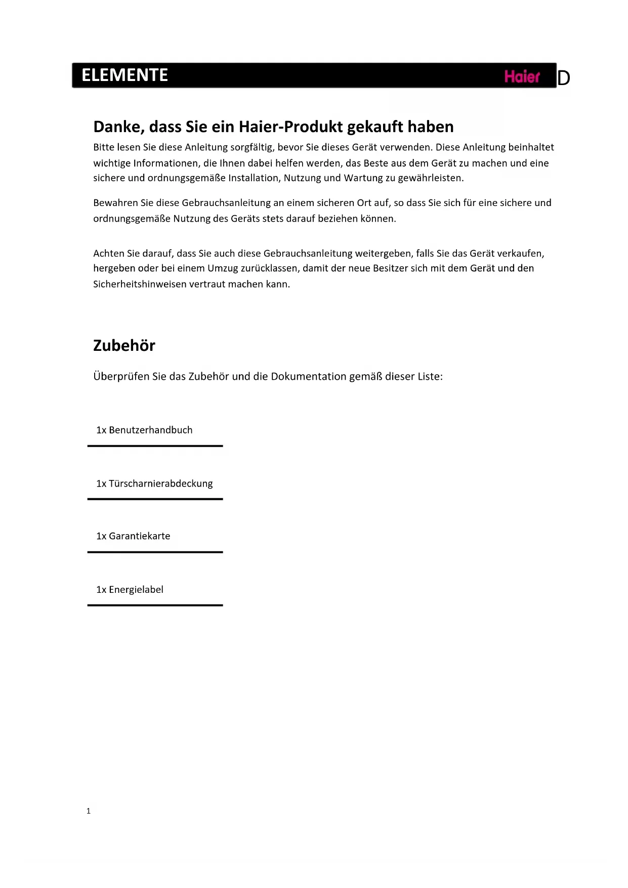Danke,dassSieeinHaier‐Produktgekaufthaben BittelesenSiedieseAnleitungsorgfältig,bevorSiedieses Gerätverwenden.DieseAnleitungbeinhaltet wichtigeInformationen,dieIhnendabe ihelfenwerden,dasBesteausdemGer ä tzumachenundeine sichereundordnungsgemäßeInstallation,NutzungundWartungzugewährleisten.