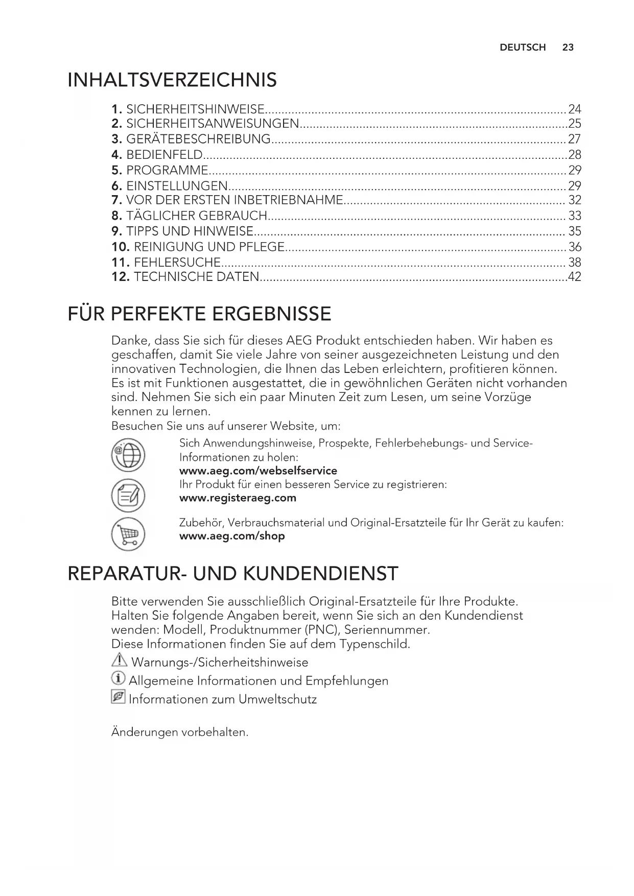 Bitte verwenden Sie ausschließlich Original-Ersatzteile für Ihre Produkte. Halten Sie folgende Angaben bereit, wenn Sie sich an den Kundendienst wenden: Modell, Produktnummer (PNC), Seriennummer. Diese Informationen finden Sie auf dem Typenschild. Warnungs-/Sicherheitshinweise Allgemeine Informationen und Empfehlungen Informationen zum Umweltschutz Änderungen vorbehalten. DEUTSCH
