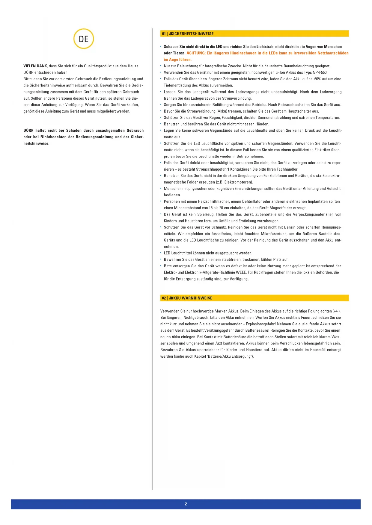 Bitte entsorgen Sie das Gerät wenn es defekt ist oder keine Nutzung mehr geplant ist entsprechend der Elektro- und Elektronik-Altgeräte-Richtlinie WEEE. Für Rückfragen stehen Ihnen die lokalen Behörden, die für die Entsorgung zuständig sind, zur Verfügung. 02 | AKKU WARNHINWEISE Verwenden Sie nur hochwertige Marken Akkus. Beim Einlegen des Akkus auf die richtige Polung achten (+/-). Bei längerem Nichtgebrauch, bitte den Akku entnehmen. Werfen Sie Akkus nicht ins Feuer, schließen Sie sie nicht kurz und nehmen Sie sie nicht auseinander – Explosionsgefahr! Nehmen Sie auslaufende Akkus sofort aus dem Gerät. Es besteht Verätzungsgefahr durch Batteriesäure! Reinigen Sie die Kontakte, bevor Sie einen neuen Akku einlegen. Bei Kontakt mit Batteriesäure die betro enen Stellen sofort mit reichlich klarem Was- ser spülen und umgehend einen Arzt kontaktieren. Akkus können beim Verschlucken lebensgefährlich sein. Bewahren Sie Akkus unerreichbar für Kinder und Haustiere auf. Akkus dürfen nicht im Hausmüll entsorgt werden (siehe auch Kapitel "Batterie/Akku Entsorgung").3 1 LED Leuchtfl äche 2 Kontrolleinheit 3 Helligkeitsregler 4 Blitzschuh 5 Ein-/Ausschalter 6 Anschlussbuchse für Netzteil (optional) 7 ¼" Stativgewinde (7a unten, 7b seitlich) 8 Akkuschacht 9 Entriegelungstaste Akku 10 Akku-Anschlusskontakte +/- 11 LED Anzeige 12 Akku-Ladegerät 13 Anschlussbuchse Netzkabel 14 Ladeschacht 15 Akku-Anschlusskontakte +/- 16 LED Ladeanzeige 17 Netzkabel 18 Li-Ion Akku 19 Akku-Kontakte +/- 20 Kugelkopf 21 ¼" Anschlussschraube 22 Feststellschraube Kugelkopf 23 ¼" Stativgewinde 24 Universal-Blitzfuß 25 Feststellschraube Blitzfuß 03 | PRODUKTBESCHREIBUNG Die DÖRR LED FX Flex Panels sind mit der neuesten LED Technik ausgestattet und absolut fl exibel in der Anwendung. Selbst in schwer zugänglichen Bereichen oder auf kleinstem Raum sorgen die LED Flex Panels für eine gleichmäßige, helle Ausleuchtung. Mit einer Höhe von nur 10mm lassen sie sich falten oder aufrollen und sind leicht zu transportieren. Geeignet für Porträt-, Produkt- und Videoaufnahmen. 04 | EIGENSCHAFTEN