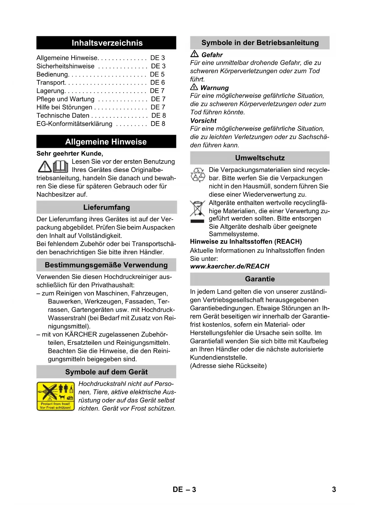 Register and win! www.karcher .com 59649210 (11/12) K 2 Basic Deutsch 3 English 10 Français 16 Italiano 23 Nederlands 30 Español 37 Português 44 Dansk 51 Norsk 57 Svenska 63 Suomi 69 Ελληνικά 75 Türkçe 82 Русский 88 Magyar 95 Čeština 102 Slovenščina 109 Polski 115 Româneşte 122 Slovenčina 128 Hrvatski 134 Srpski 140 Български 146 Eesti 153 Latviešu 159 Lietuviškai 166 Українська 1722– 3 Sehr geehrter Kunde, Lesen Sie vor der ersten Benutzung Ihres Gerätes diese Originalbe- triebsanleitung, handeln Sie danach und bewah- ren Sie diese für späteren Gebrauch oder für Nachbesitzer auf. Der Lieferumfang ihres Gerätes ist auf der Ver- packung abgebildet. Prüfen Sie beim Auspacken den Inhalt auf Vollständigkeit. Bei fehlendem Zubehör oder bei Transportschä- den benachrichtigen Sie bitte ihren Händler. Verwenden Sie diesen Hochdruckreiniger aus- schließlich für den Privathaushalt: – zum Reinigen von Maschinen, Fahrzeugen, Bauwerken, Werkzeugen, Fassaden, Ter- rassen, Gartengeräten usw. mit Hochdruck- Wasserstrahl (bei Bedarf mit Zusatz von Rei- nigungsmittel). – mit von KÄRCHER zugelassenen Zubehör- teilen, Ersatzteilen und Reinigungsmitteln. Beachten Sie die Hinweise, die den Reini- gungsmitteln beigegeben sind. Hochdruckstrahl nicht auf Perso- nen, Tiere, aktive elektrische Aus- rüstung oder auf das Gerät selbst richten. Gerät vor Frost schützen. Gefahr Für eine unmittelbar drohende Gefahr, die zu schweren Körperverletzungen oder zum Tod führt. 몇 Warnung Für eine möglicherweise gefährliche Situation, die zu schweren Körperverletzungen oder zum Tod führen könnte. Vorsicht Für eine möglicherweise gefährliche Situation, die zu leichten Verletzungen oder zu Sachschä- den führen kann. Die Verpackungsmaterialien sind recycle- bar. Bitte werfen Sie die Verpackungen nicht in den Hausmüll, sondern führen Sie diese einer Wiederverwertung zu. Altgeräte enthalten wertvolle recyclingfä- hige Materialien, die einer Verwertung zu- geführt werden sollten. Bitte entsorgen Sie Altgeräte deshalb über geeignete Sammelsysteme. Hinweise zu Inhaltsstoffen (REACH) Aktuelle Informationen zu Inhaltsstoffen finden Sie unter: www.kaercher.de/REACH In jedem Land gelten die von unserer zuständi- gen Vertriebsgesellschaft herausgegebenen Garantiebedingungen. Etwaige Störungen an Ih- rem Gerät beseitigen wir innerhalb der Garantie- frist kostenlos, sofern ein Material- oder Herstellungsfehler die Ursache sein sollte. Im Garantiefall wenden Sie sich bitte mit Kaufbeleg an Ihren Händler oder die nächste autorisierte Kundendienststelle. (Adresse siehe Rückseite) Inhaltsverzeichnis Allgemeine Hinweise... DE 3 Sicherheitshinweise ... DE 3 Bedienung... DE 5 Transport... DE 6 Lagerung... DE 7 Pflege und Wartung ... DE 7 Hilfe bei Störungen ... DE 7 Technische Daten ... DE 8 EG-Konformitätserklärung ... DE 8 Allgemeine Hinweise Lieferumfang Bestimmungsgemäße Verwendung Symbole auf dem Gerät Symbole in der Betriebsanleitung Umweltschutz Garantie 3DE– 4 Gefahr Netzstecker und Steckdose niemals mit feuchten Händen anfassen. Das Gerät nicht in Betrieb setzen, wenn die Netzanschlussleitung oder wichtige Teile des Gerätes, z.B. Hochdruckschlauch, Handspritzpistole oder Sicherheitseinrich- tungen beschädigt sind. Netzanschlussleitung mit Netzstecker vor je- dem Betrieb auf Schäden prüfen. Beschä- digte Netzanschlussleitung unverzüglich durch autorisierten Kundendienst/Elektro- Fachkraft austauschen lassen. Hochdruckschlauch vor jedem Betrieb auf Schäden prüfen. Beschädigten Hochdruck- schlauch unverzüglich austauschen. Der Betrieb in explosionsgefährdeten Berei- chen ist untersagt. Beim Einsatz des Gerätes in Gefahrberei- chen (z.B. Tankstellen) sind die entspre- chenden Sicherheitsvorschriften zu beachten. Hochdruckstrahlen können bei unsachge- mäßem Gebrauch gefährlich sein. Der Strahl darf nicht auf Personen, Tiere, aktive elektri- sche Ausrüstung oder auf das Gerät selbst gerichtet werden. Den Hochdruckstrahl nicht auf andere oder sich selbst richten, um Kleidung oder Schuh- werk zu reinigen. Keine Gegenstände abspritzen, die gesund- heitsgefährdende Stoffe (z.B. Asbest) ent- halten. Fahrzeugreifen/Reifenventile können durch den Hochdruckstrahl beschädigt werden und platzen. Erstes Anzeichen hierfür ist eine Verfärbung des Reifens. Beschädigte Fahrzeugreifen/Reifenventile sind lebensge- fährlich. Mindestens 30 cm Strahlabstand bei der Reinigung einhalten! Explosionsgefahr! Keine brennbaren Flüssigkeiten versprühen. Niemals lösungsmittelhaltige Flüssigkeiten oder unverdünnte Säuren und Lösungsmittel ansaugen! Dazu zählen z.B. Benzin, Farb- verdünner oder Heizöl. Der Sprühnebel ist hochentzündlich, explosiv und giftig. Kein Aceton, unverdünnte Säuren und Lösungs- mittel verwenden, da sie die am Gerät ver- wendeten Materialien angreifen. 몇 Warnung Netzstecker und Kupplung einer Verlänge- rungsleitung müssen wasserdicht sein und dürfen nicht im Wasser liegen. Ungeeignete Verlängerungsleitungen kön- nen gefährlich sein. Verwenden Sie im Frei- en nur dafür zugelassene und entsprechend gekennzeichnete Verlängerungsleitungen mit ausreichendem Leitungsquerschnitt: