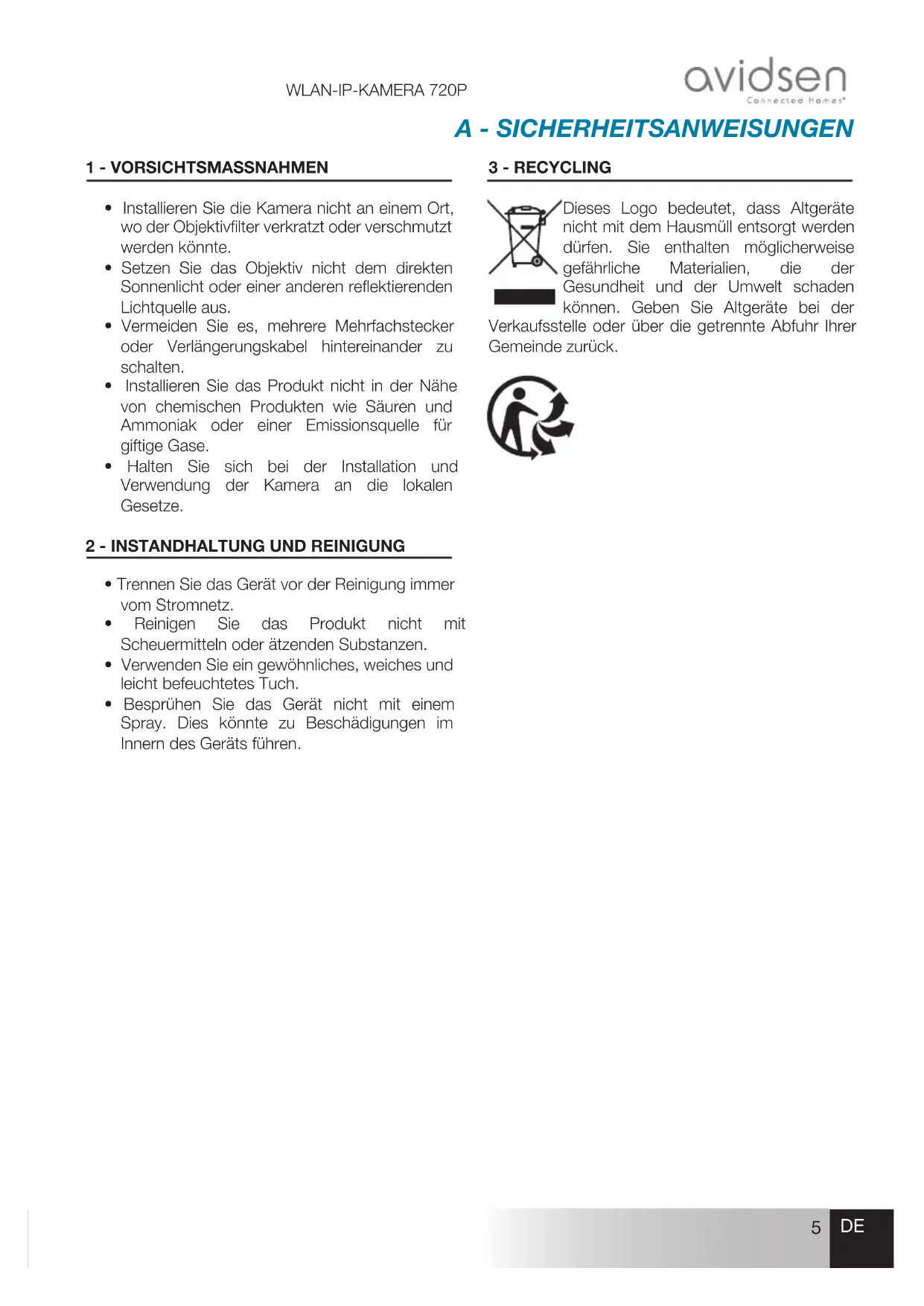 Konformität mit der R&TTE-Richtlinie AVIDSEN erklärt, dass das nachfolgende Gerät: WLAN-IP-Außenkamera 720P 123581 der RED-Richtlinie entspricht und die Konformität in Anwendung der geltenden Normen bewertet wurde: EN 60950-1:2006+A11:2009+A1:2010+A12:2011 +A2:2013 EN 62311:2008 EN 301 489-1 V2.1.1 (2017-02) EN 301 489-17 V3.1.1 (2017-02) EN 300 328 V2.1.1 (2016-11) Chambray les Tours, 19.07.2017 Alexandre Chaverot, Präsident H - TECHNISCHE UND GESETZLICHE INFORMATIONENAvidsen France S.A.S - 32, rue Augustin Fresnel 37170 Chambray les Tours - Frankreich