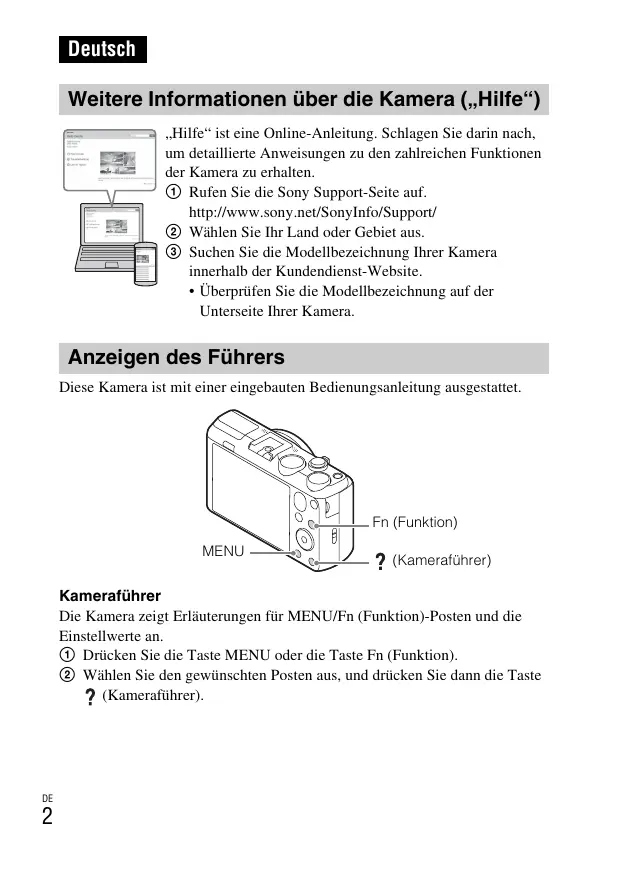 - Überprüfen Sie die Modellbezeichnung auf der Unterseite Ihrer Kamera. Anzeigen des Führers Diese Kamera ist mit einer eingebauten Bedienungsanleitung ausgestattet. Fn (Funktion) MENU (Kameraführer) Kameraführer Die Kamera zeigt Erläuterungen für MENU/Fn (Funktion)-Posten und die Einstellwerte an. 1 Drücken Sie die Taste MENU oder die Taste Fn (Funktion). 2 Wählen Sie den gewünschten Posten aus, und drücken Sie dann die Taste (Kameraführer).