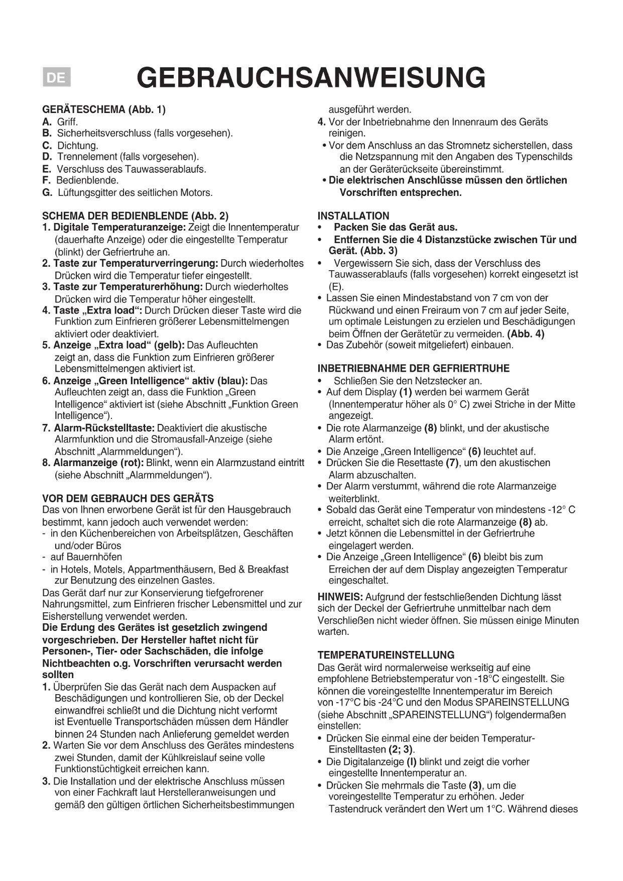 GERÄTESCHEMA (Abb. 1) A. Gri. B. Sicherheitsverschluss (falls vorgesehen). C. Dichtung. D. Trennelement (falls vorgesehen). E. Verschluss des Tauwasserablaufs. F. Bedienblende. G. Lüftungsgitter des seitlichen Motors. SCHEMA DER BEDIENBLENDE (Abb. 2)