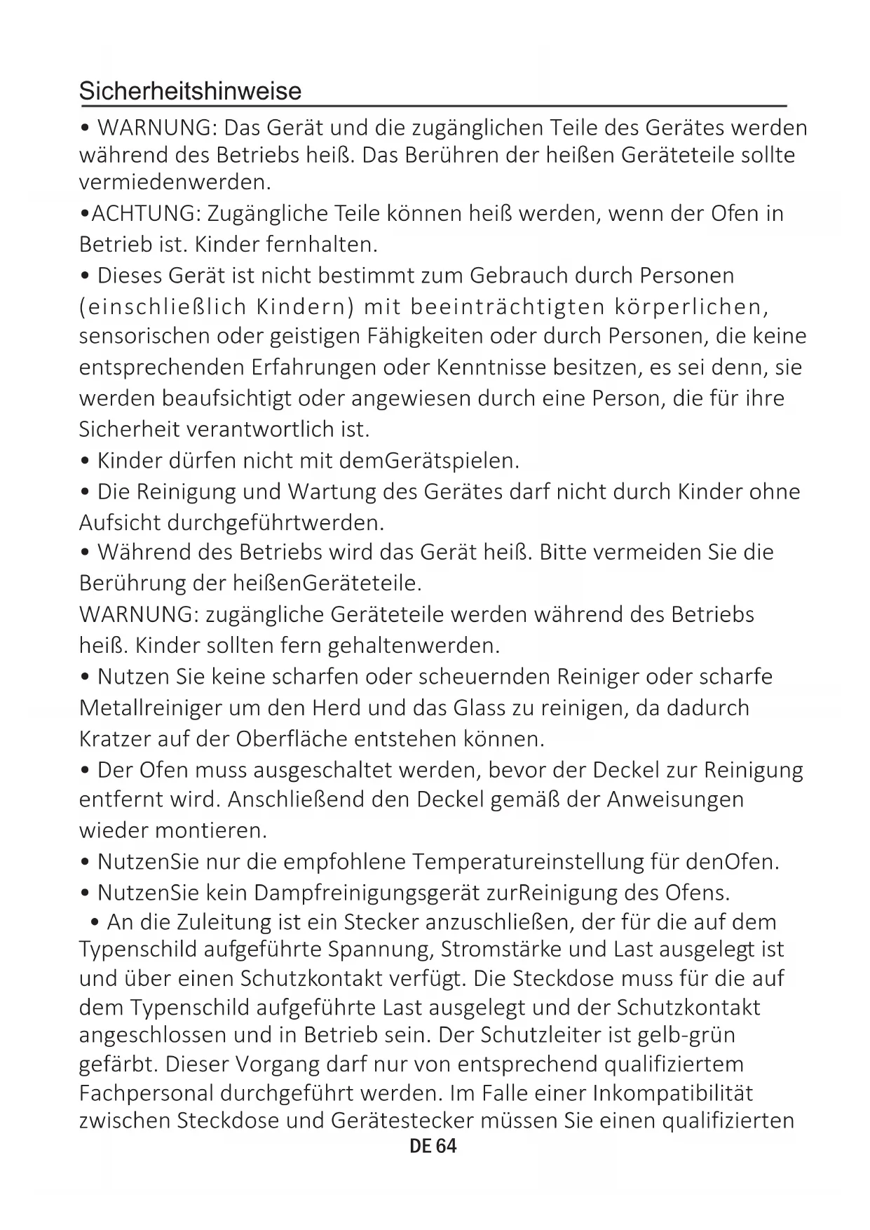 - Die Reinigung und Wartung des Gerätes darf nicht durch Kinder ohne Aufsicht durchgeführtwerden.