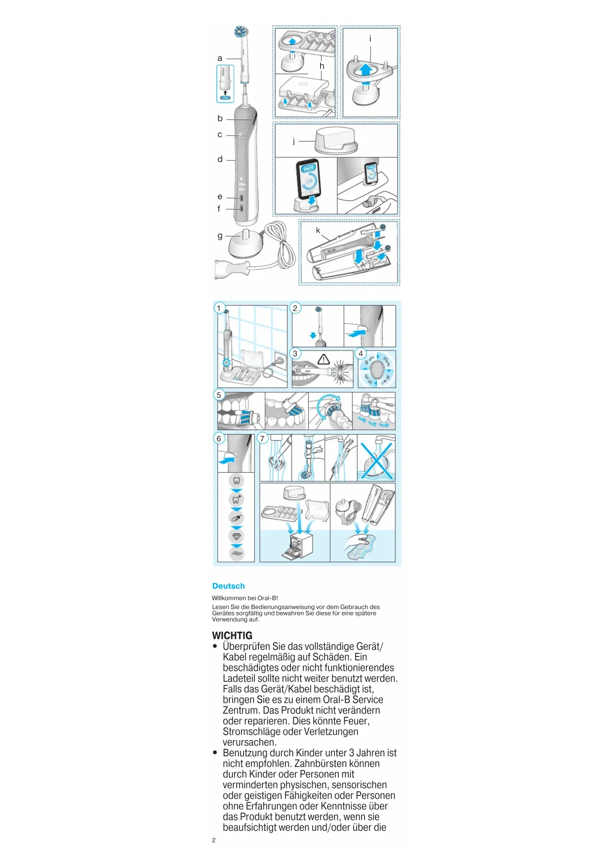 Überprüfen Sie das vollständige Gerät/ Kabel regelmäßig auf Schäden. Ein beschädigtes oder nicht funktionierendes Ladeteil sollte nicht weiter benutzt werden. Falls das Gerät/Kabel beschädigt ist, bringen Sie es zu einem Oral-B Service Zentrum. Das Produkt nicht verändern oder reparieren. Dies könnte Feuer, Stromschläge oder Verletzungen verursachen.