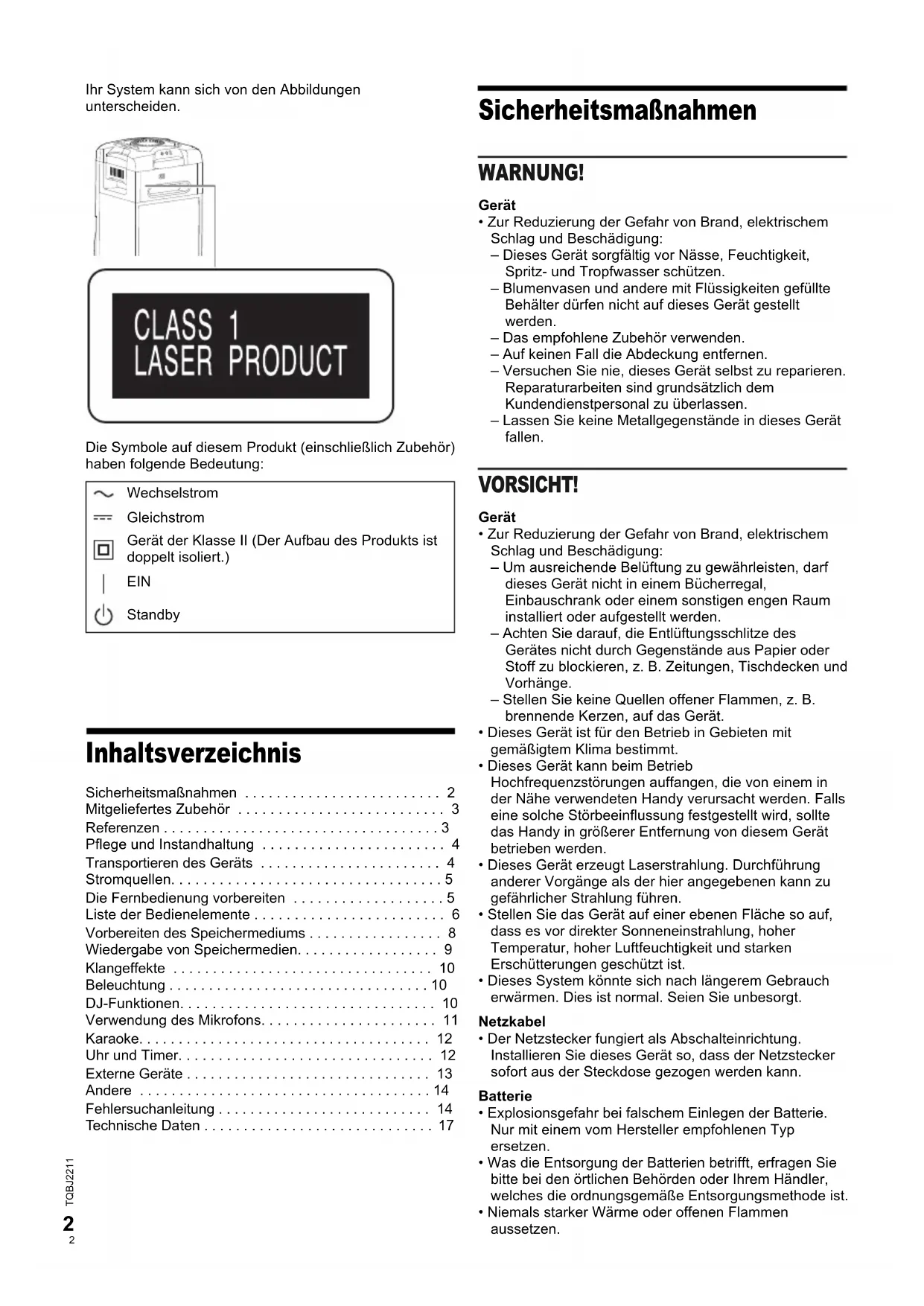 - TQBJ2211 Ihr System kann sich von den Abbildungen unterscheiden.Die Symbole auf diesem Produkt (einschließlich Zubehör) haben folgende Bedeutung: Inhaltsverzeichnis Sicherheitsmaßnahmen p. 2