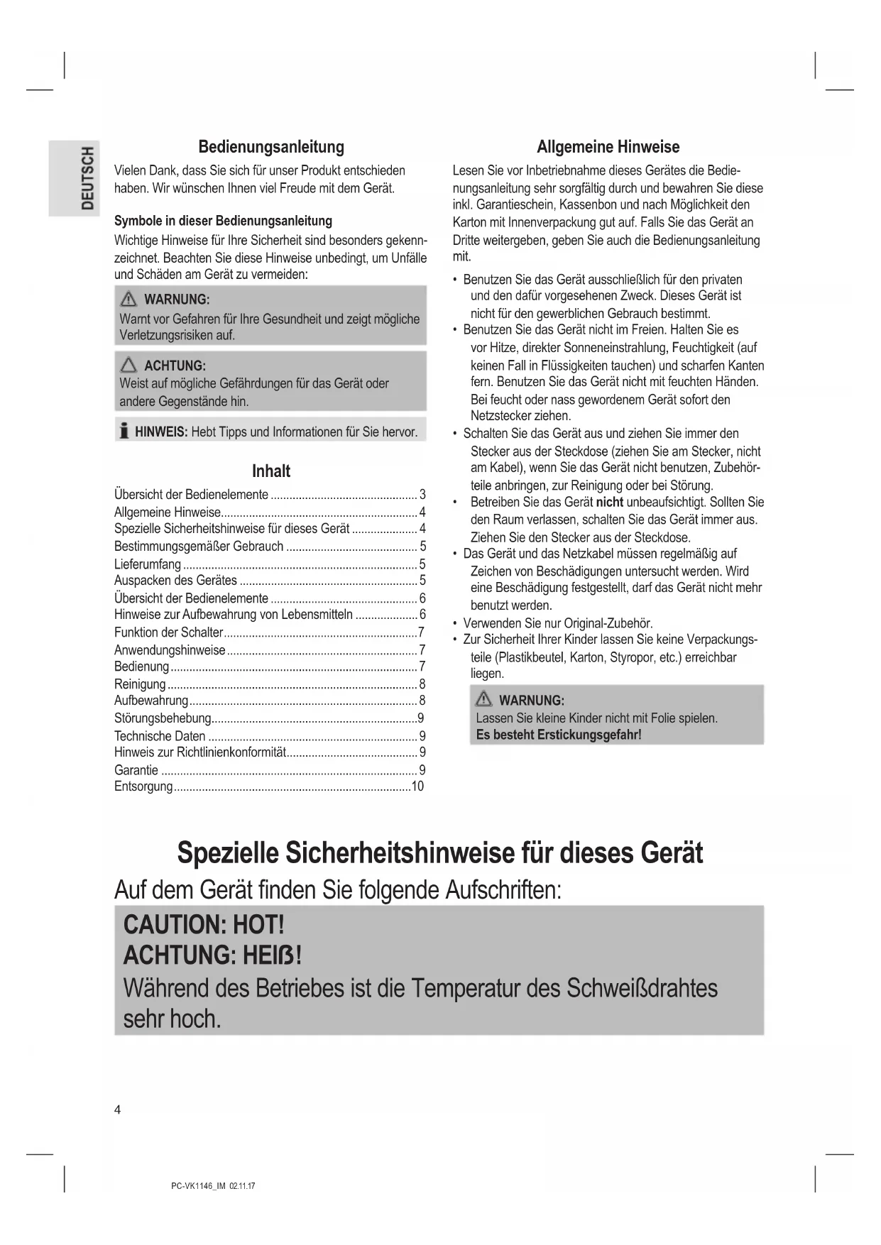 Während des Betriebes ist die Temperatur des Schweißdrahtes sehr hoch.5 PC-VK1146_IM 02.11.17 DON’T LOCK THE LID WHILE NOT IN USE! VERRIEGELN SIE NICHT DEN DECKEL, WENN SIE DAS GERÄT NICHT BENUTZEN! Legen Sie den Deckel bei Nichtbenutzung immer nur auf, um die Dichtungen nicht zu beschädigen.