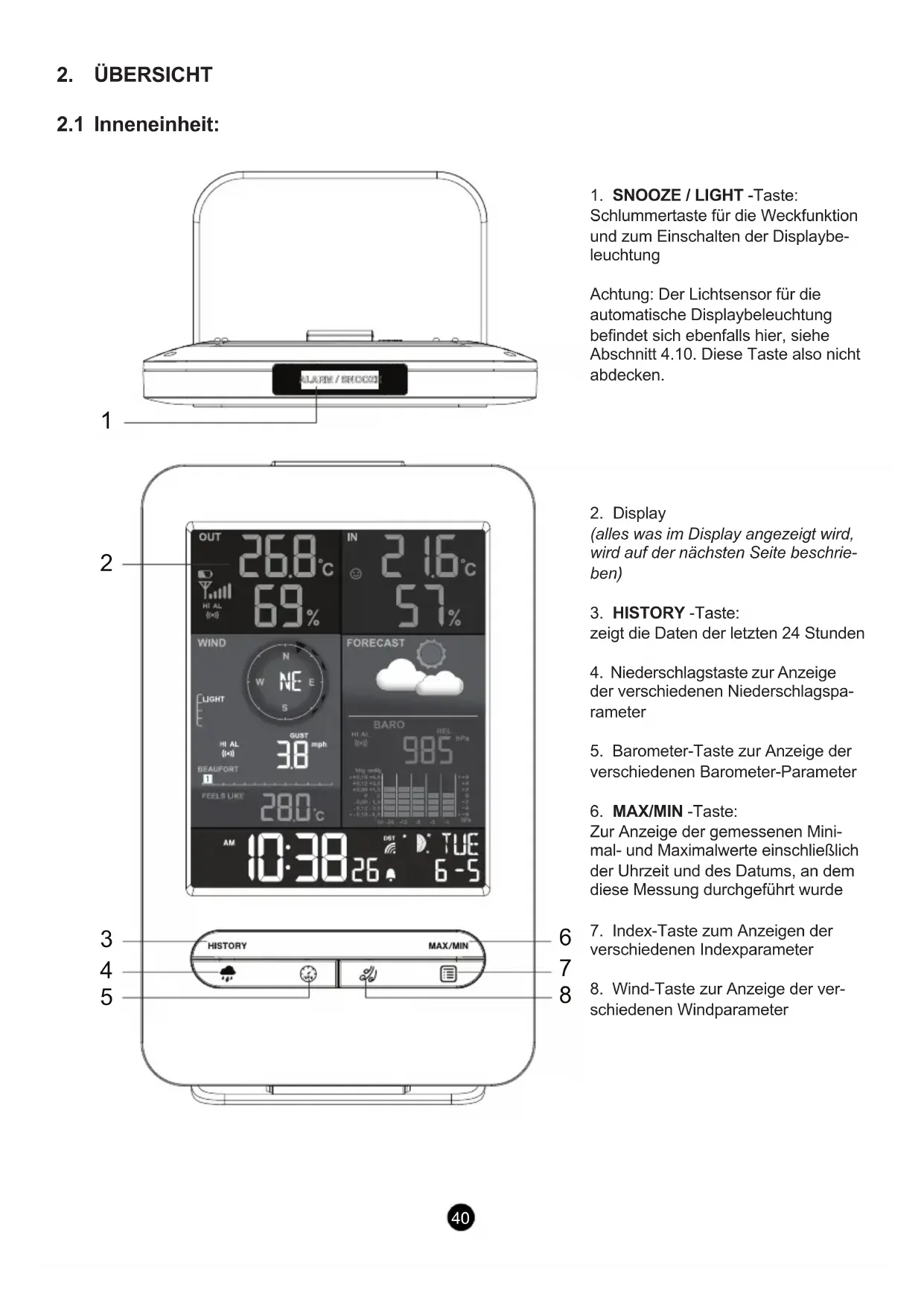 Schlummertaste für die Weckfunktion und zum Einschalten der Displaybe- leuchtung Achtung: Der Lichtsensor für die automatische Displaybeleuchtung bendet sich ebenfalls hier, siehe Abschnitt 4.10. Diese Taste also nicht abdecken.
