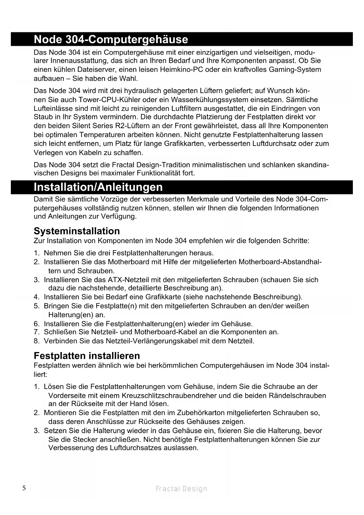 Node 304-Computergehäuse Installation/Anleitungen Das Node 304 ist ein Computergehäuse mit einer einzigartigen und vielseitigen, modu- larer Innenausstattung, das sich an Ihren Bedarf und Ihre Komponenten anpasst. Ob Sie einen kühlen Dateiserver, einen leisen Heimkino-PC oder ein kraftvolles Gaming-System aufbauen – Sie haben die Wahl. Das Node 304 wird mit drei hydraulisch gelagerten Lüftern geliefert; auf Wunsch kön- nen Sie auch Tower-CPU-Kühler oder ein Wasserkühlungssystem einsetzen. Sämtliche Lufteinlässe sind mit leicht zu reinigenden Luftltern ausgestattet, die ein Eindringen von Staub in Ihr System vermindern. Die durchdachte Platzierung der Festplatten direkt vor den beiden Silent Series R2-Lüftern an der Front gewährleistet, dass all Ihre Komponenten bei optimalen Temperaturen arbeiten können. Nicht genutzte Festplattenhalterung lassen sich leicht entfernen, um Platz für lange Grakkarten, verbesserten Luftdurchsatz oder zum Verlegen von Kabeln zu schaffen. Das Node 304 setzt die Fractal Design-Tradition minimalistischen und schlanken skandina- vischen Designs bei maximaler Funktionalität fort. Damit Sie sämtliche Vorzüge der verbesserten Merkmale und Vorteile des Node 304-Com- putergehäuses vollständig nutzen können, stellen wir Ihnen die folgenden Informationen und Anleitungen zur Verfügung. Systeminstallation Zur Installation von Komponenten im Node 304 empfehlen wir die folgenden Schritte: