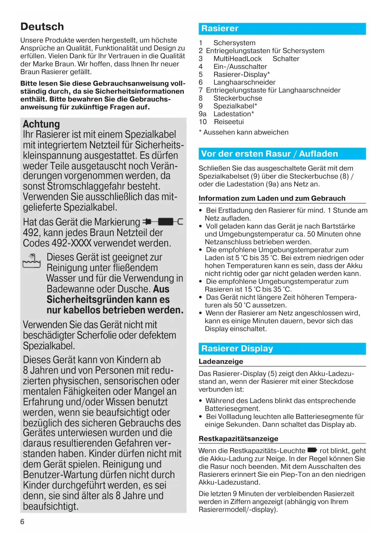 Deutsch Unsere Produkte werden hergestellt, um höchste Ansprüche an Qualität, Funktionalität und Design zu erfüllen. Vielen Dank für Ihr Vertrauen in die Qualität der Marke Braun. Wir hoffen, dass Ihnen Ihr neuer Braun Rasierer gefällt. Bitte lesen Sie diese Gebrauchsanweisung voll- ständig durch, da sie Sicherheitsinformationen enthält. Bitte bewahren Sie die Gebrauchs- anweisung für zukünftige Fragen auf. Achtung Ihr Rasierer ist mit einem Spezialkabel mit integriertem Netzteil für Sicherheits- kleinspannung ausgestattet. Es dürfen weder Teile ausgetauscht noch Verän- derungen vorgenommen werden, da sonst Stromschlaggefahr besteht. Verwenden Sie ausschließlich das mit- gelieferte Spezialkabel. Hat das Gerät die Markierung 492, kann jedes Braun Netzteil der Codes 492-XXXX verwendet werden. Dieses Gerät ist geeignet zur Reinigung unter fließendem Wasser und für die Verwendung in Badewanne oder Dusche. Aus Sicherheitsgründen kann es nur kabellos betrieben werden. Verwenden Sie das Gerät nicht mit beschädigter Scherfolie oder defektem Spezialkabel. Dieses Gerät kann von Kindern ab 8 Jahren und von Personen mit redu- zierten physischen, sensorischen oder mentalen Fähigkeiten oder Mangel an Erfahrung und/oder Wissen benutzt werden, wenn sie beaufsichtigt oder bezüglich des sicheren Gebrauchs des Gerätes unterwiesen wurden und die daraus resultierenden Gefahren ver- standen haben. Kinder dürfen nicht mit dem Gerät spielen. Reinigung und Benutzer-Wartung dürfen nicht durch Kinder durchgeführt werden, es sei denn, sie sind älter als 8 Jahre und beaufsichtigt. Rasierer 1 Schersystem 2 Entriegelungstasten für Schersystem 3 MultiHeadLock Schalter 4 Ein-/Ausschalter 5 Rasierer-Display* 6 Langhaarschneider 7 Entriegelungstaste für Langhaarschneider 8 Steckerbuchse 9 Spezialkabel* 9a Ladestation* 10 Reiseetui
