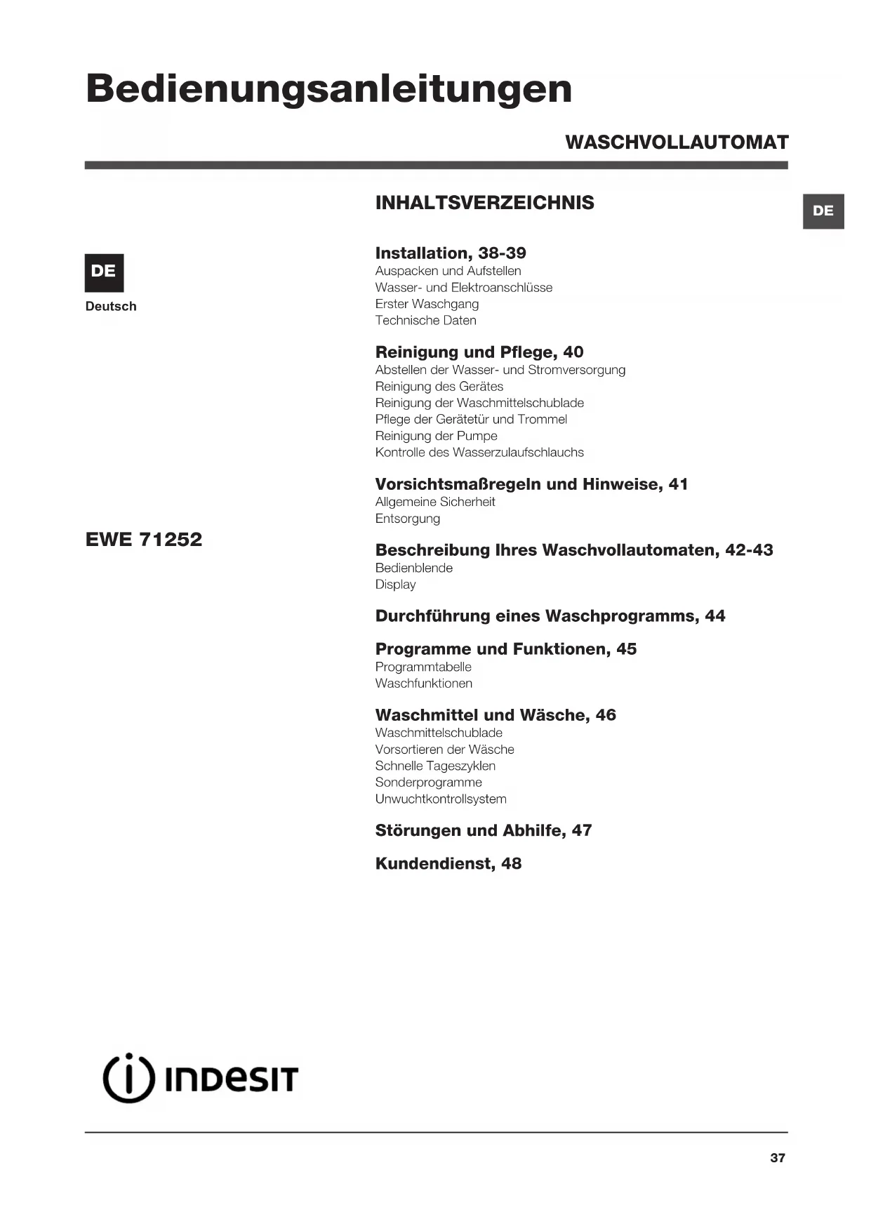 INHALTSVERZEICHNIS Installation, 38-39 Auspacken und Aufstellen Wasser- und Elektroanschlüsse Erster Waschgang Technische Daten Reinigung und Pflege, 40 Abstellen der Wasser- und Stromversorgung Reinigung des Gerätes Reinigung der Waschmittelschublade Pflege der Gerätetür und Trommel Reinigung der Pumpe Kontrolle des Wasserzulaufschlauchs Vorsichtsmaßregeln und Hinweise, 41 Allgemeine Sicherheit Entsorgung Beschreibung Ihres Waschvollautomaten, 42-43 Bedienblende Display Durchführung eines Waschprogramms, 44 Programme und Funktionen, 45 Programmtabelle Waschfunktionen Waschmittel und Wäsche, 46 Waschmittelschublade Vorsortieren der Wäsche Schnelle Tageszyklen Sonderprogramme Unwuchtkontrollsystem Störungen und Abhilfe, 47 Kundendienst, 48 EWE 71252 Bedienungsanleitungen WASCHVOLLAUTOMAT Deutsch DE38